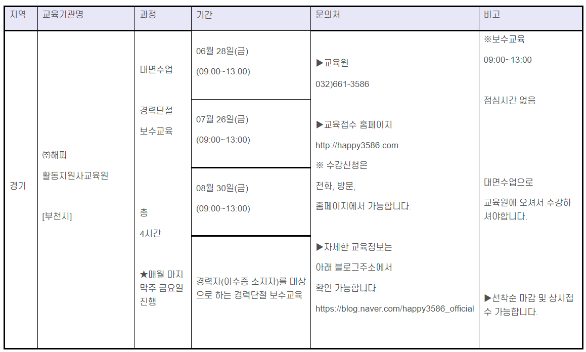 | 장애인활동지원사양성교육 | 2024년 6월(주말8차) | 표준과정:6월 1일(토),2일(일),8일(토),9일(일),15일(토)/전문과정:6월 1일(토),2일(일),8일(토),15일(토) 접수 : 4.26.(금)09:00~ 선착순으로 마감함 |