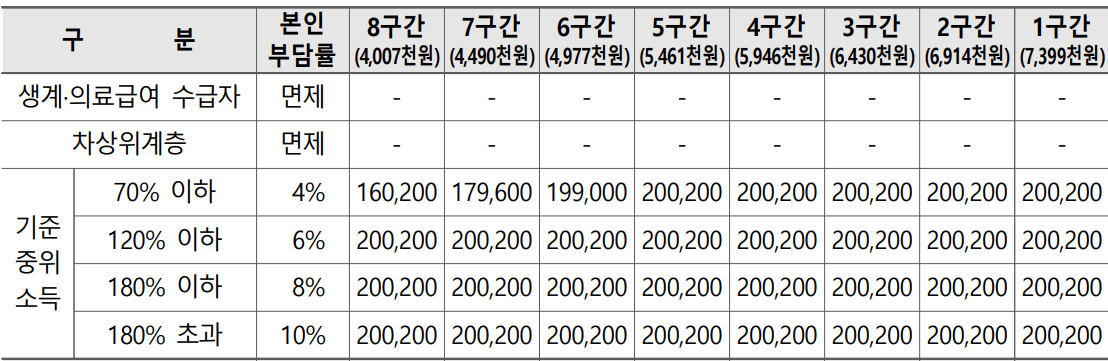 차상위계층은 중위소득 50% 이하이며, 차상위계층 초과자는 중위소득별, 구간별로 본인부담금이 4~10% 부과된다.