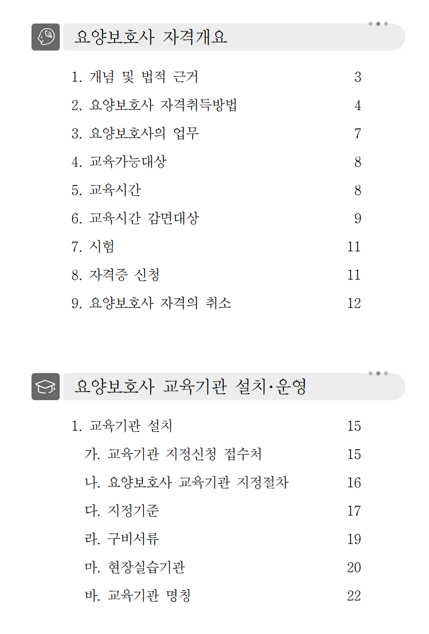 이 지침에는 요양보호사 자격 취득의 전반적인 개요, 교육 및 실습, 시험에 대해 설명되어 있다.