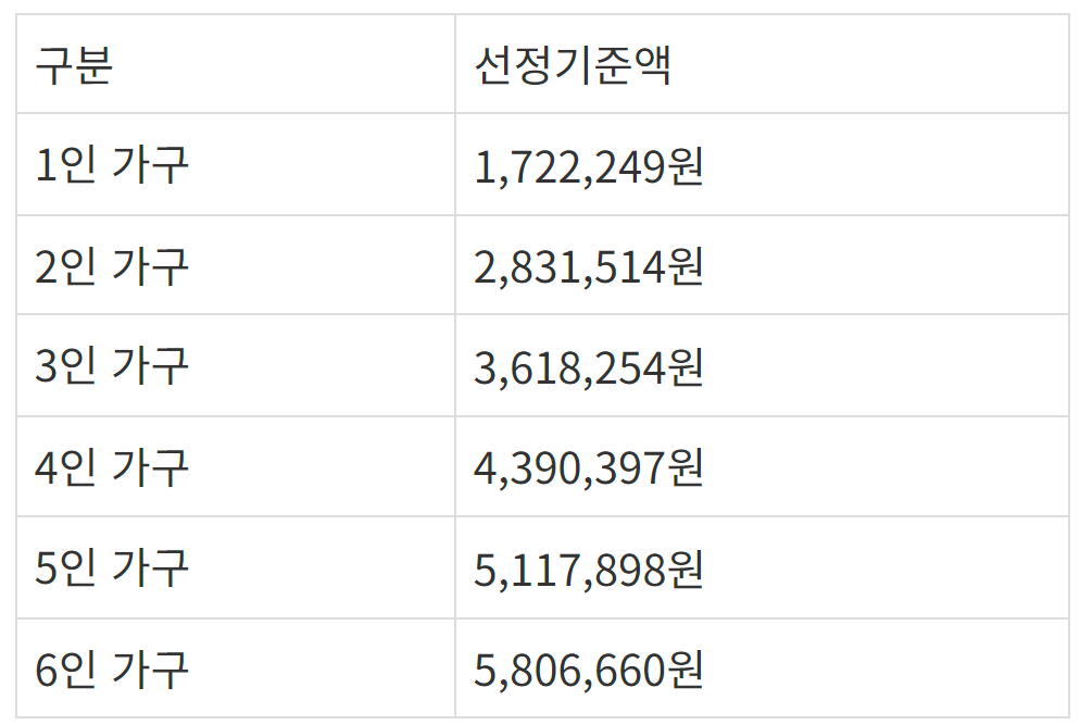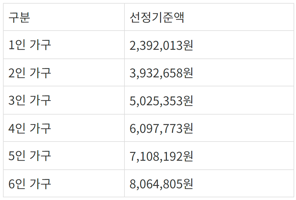 소득인정액이 아래의 선정기준액 이하이어야 지원을 받을 수 있다.