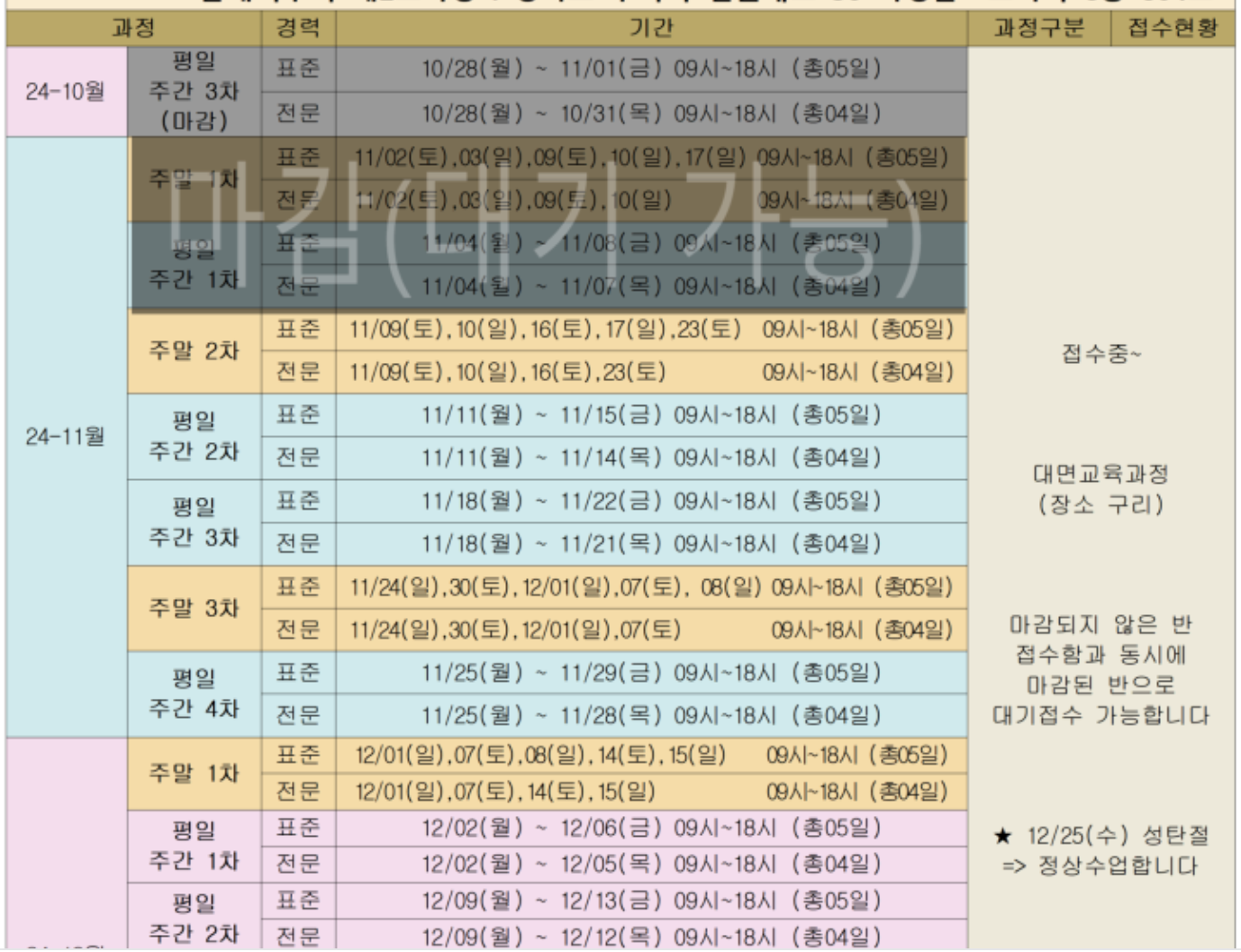 표준과정:11월23일(토),24일(일),30일(토),12월1일(일),7일(토)/전문과정:11월23일(토),24일(일),30일(토),12월7일(토) 접수 : 10.23.(수)09:00~ 선착순으로 마감함 |