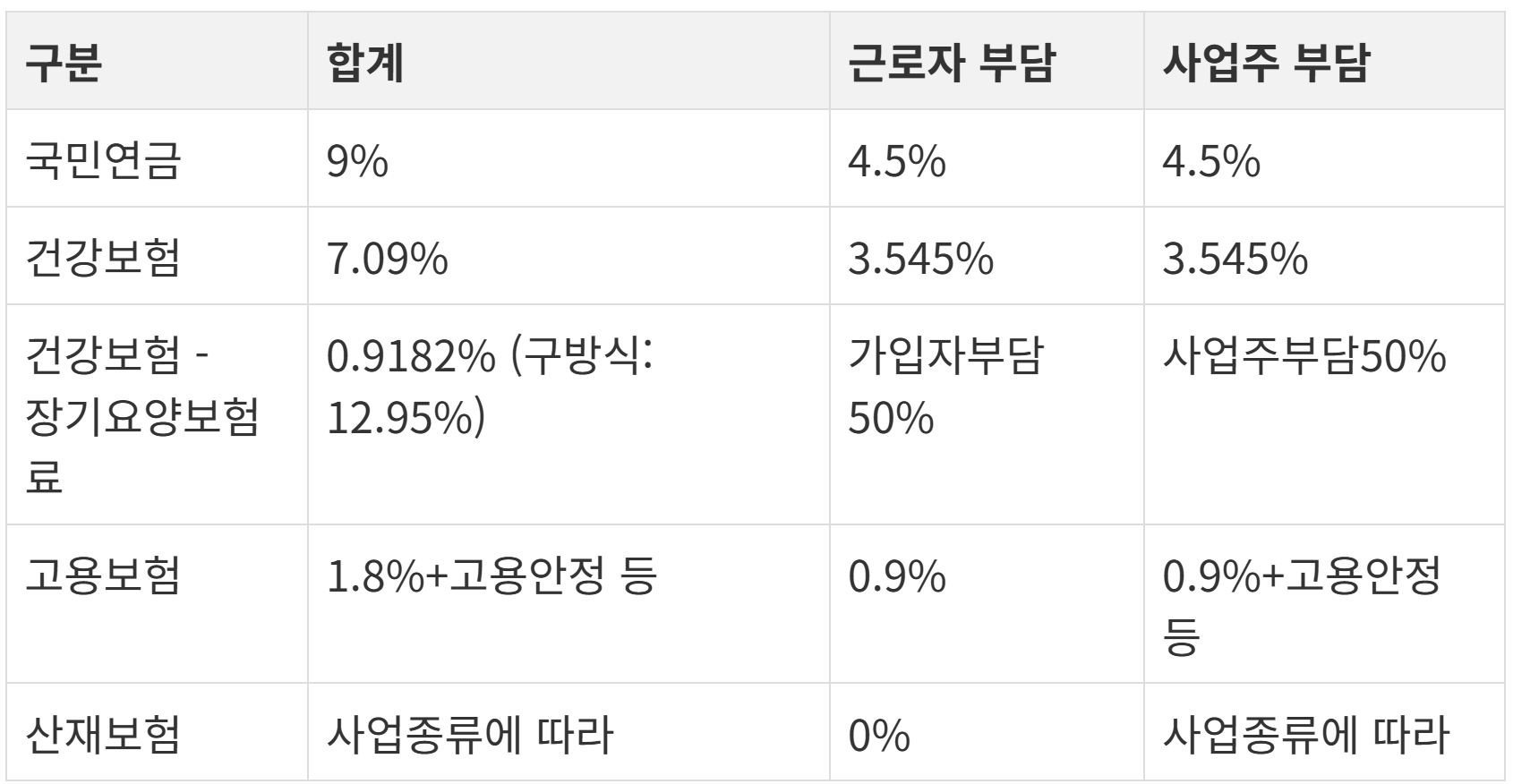국민연금, 건강보험, 장기요양보험료, 고용보험, 산재보험 자동 계산, 근로자 부담금 및 사업주 부담금 등