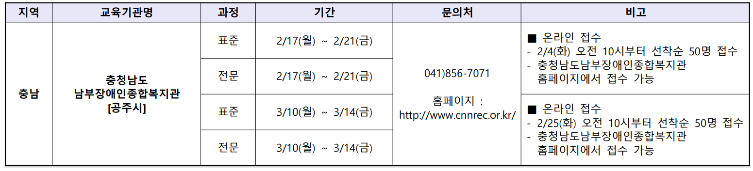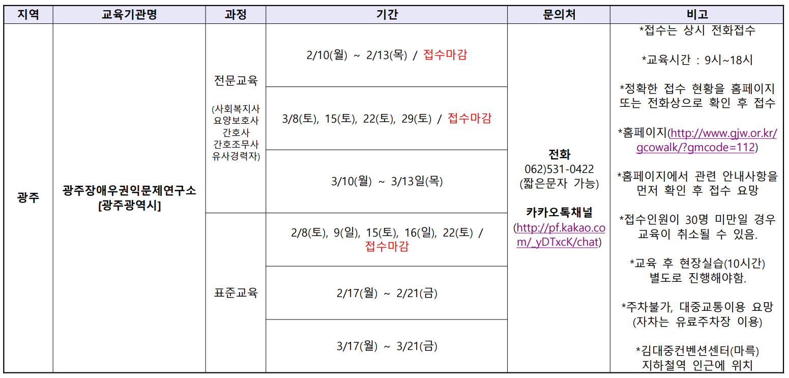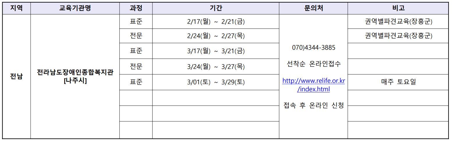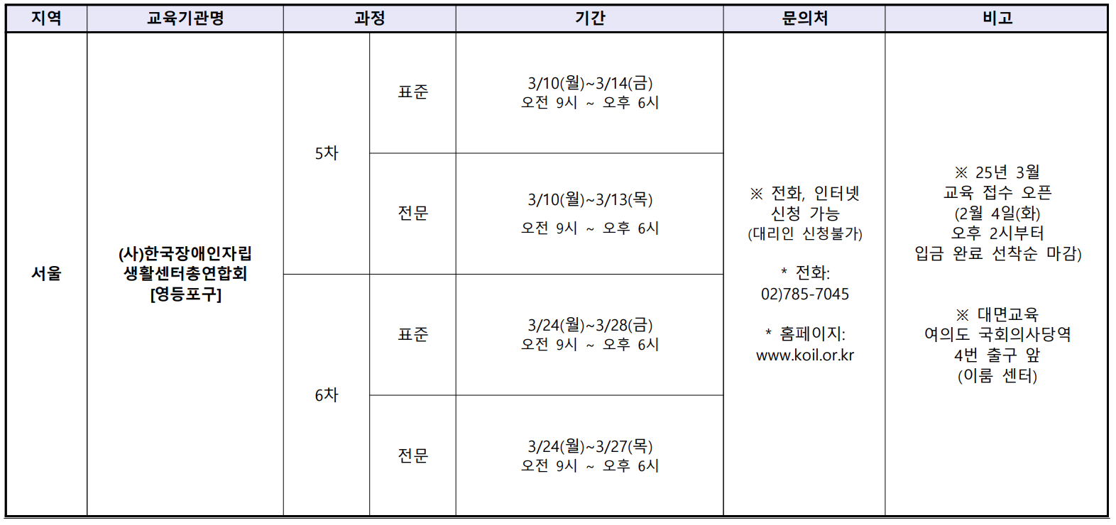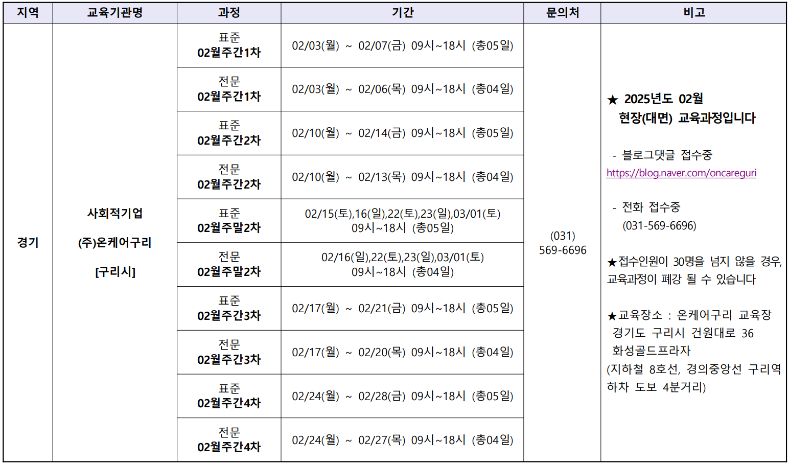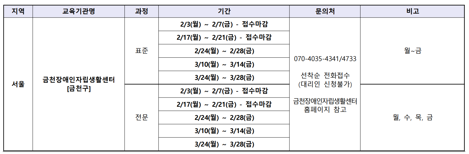 장애인활동지원사로 일하기 위한 2025년 2월 전국 교육기관 일정표이다. 교육 일정은 해당 교육기관 사정에 따라 변경될 수 있다.