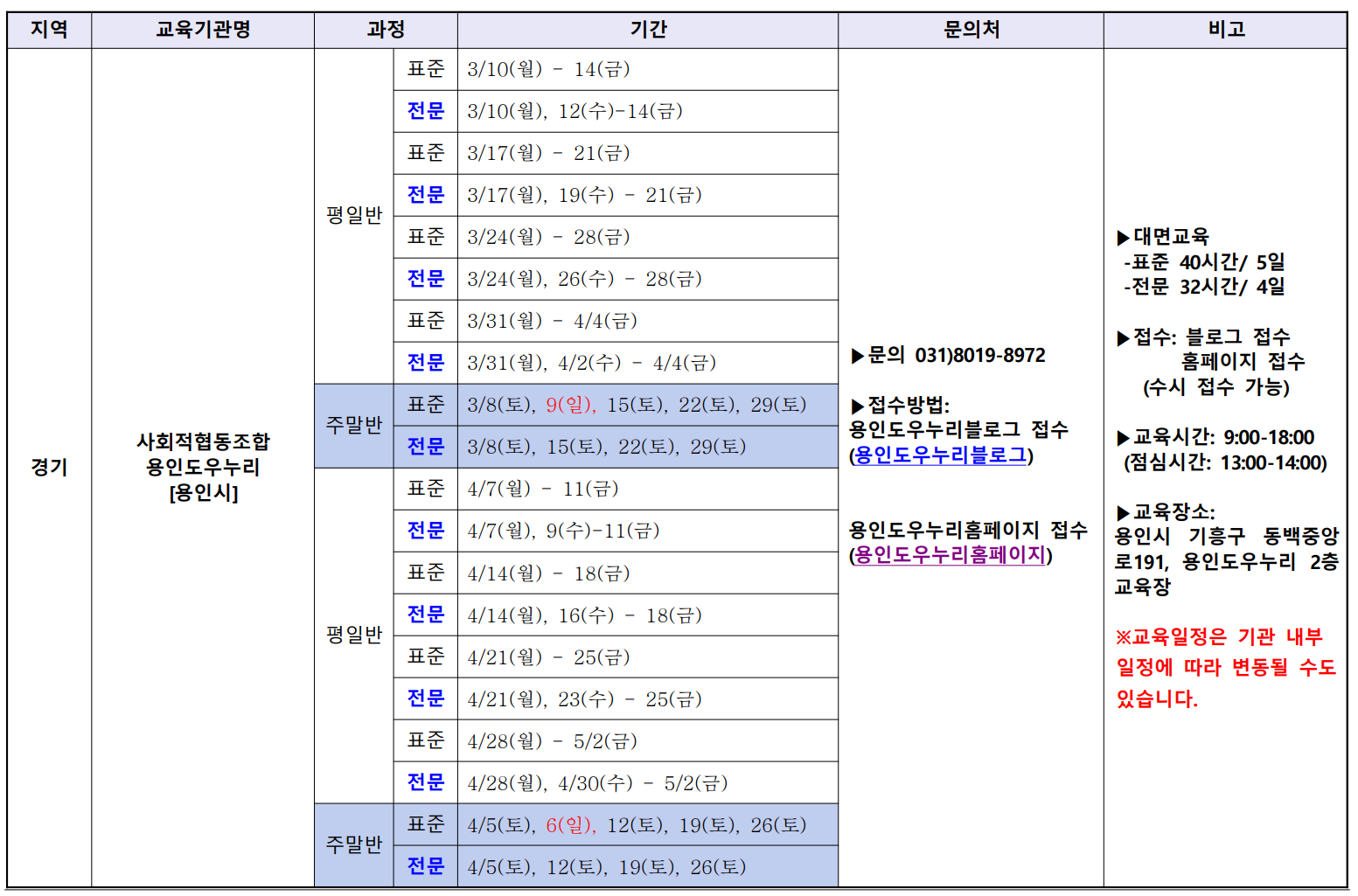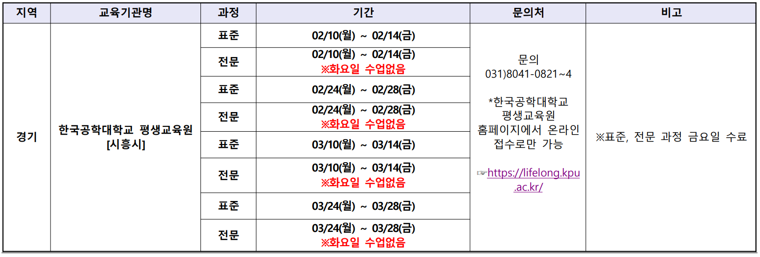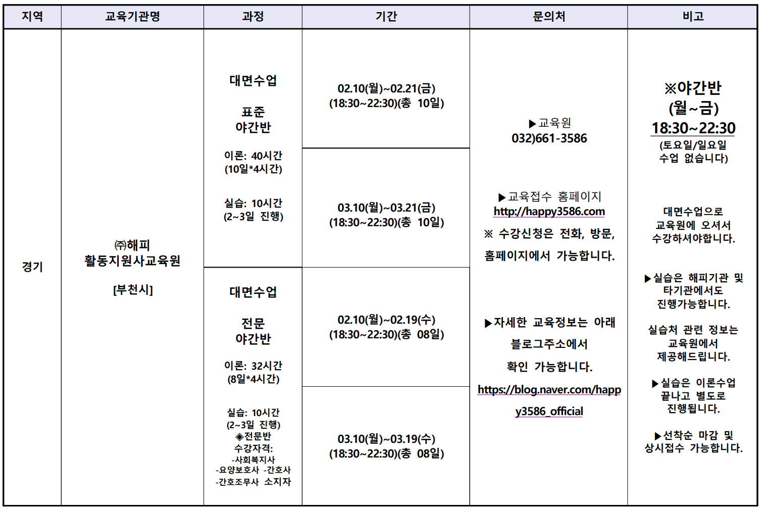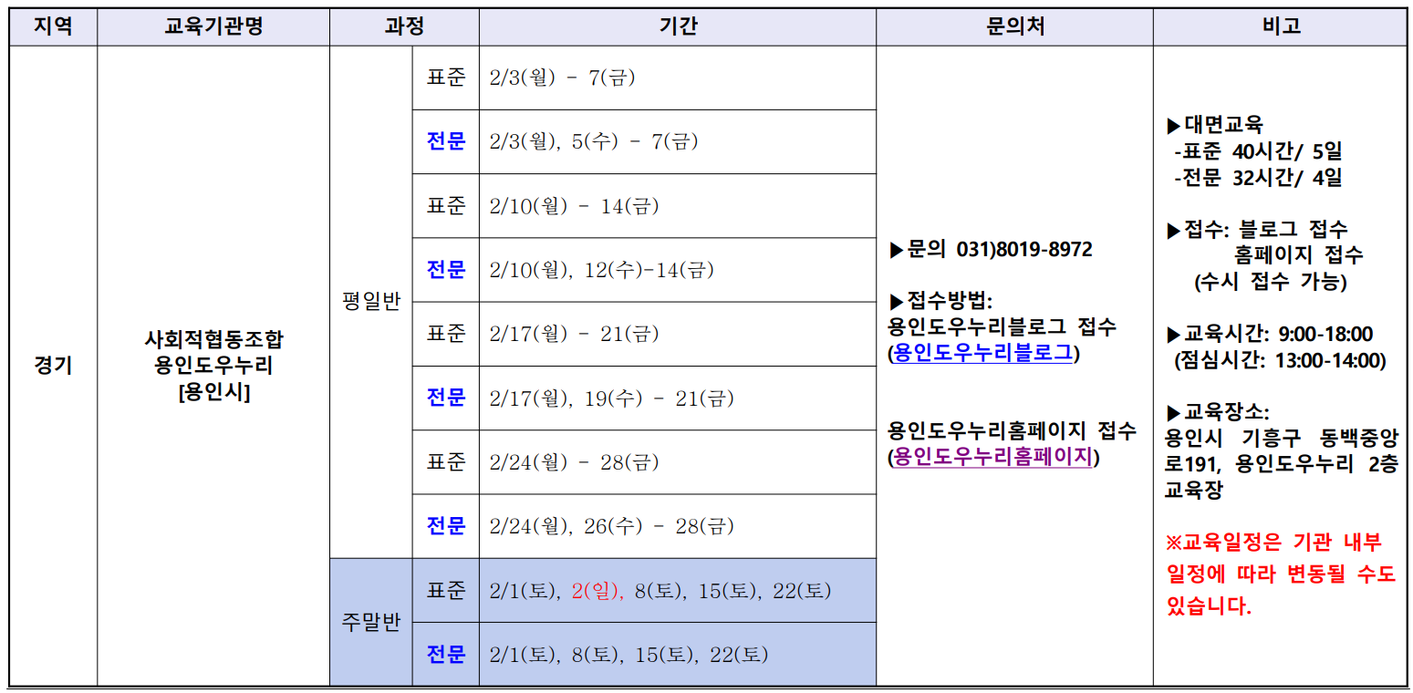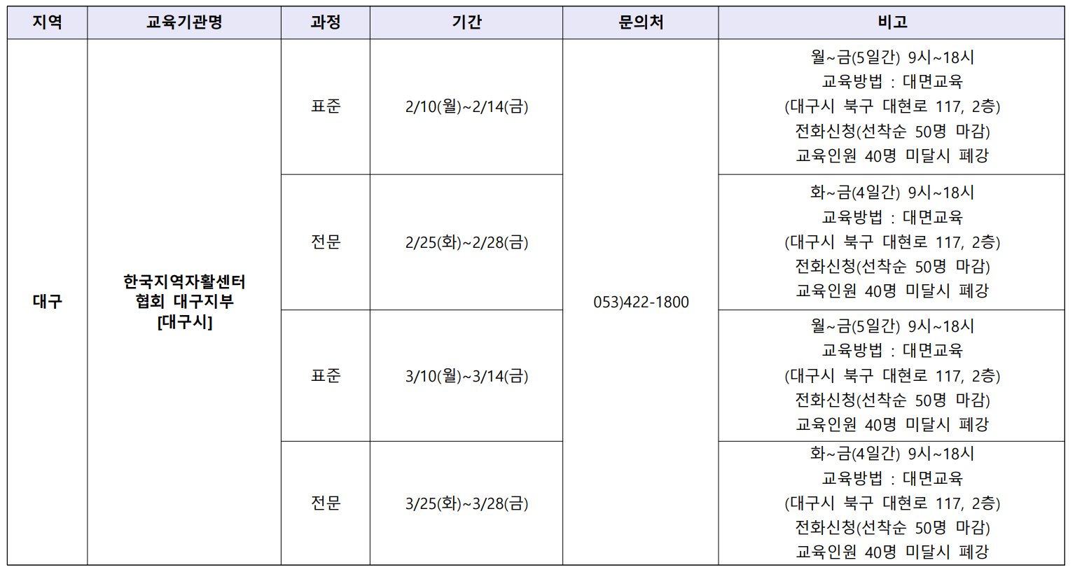 장애인활동지원사로 일하기 위한 2025년 2월 전국 교육기관 일정표이다. 교육 일정은 해당 교육기관 사정에 따라 변경될 수 있다.