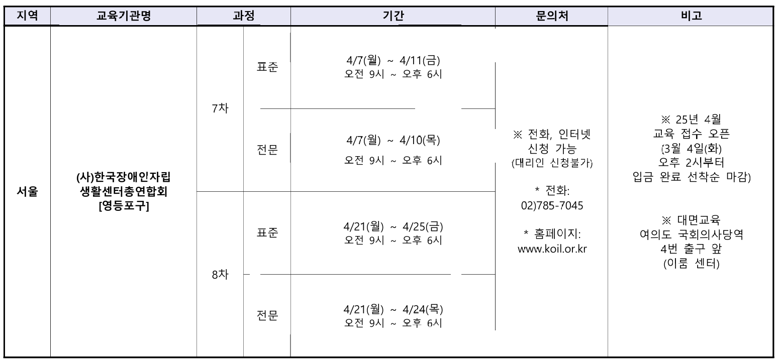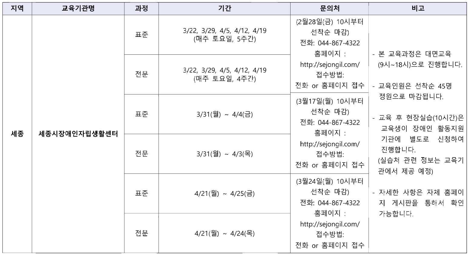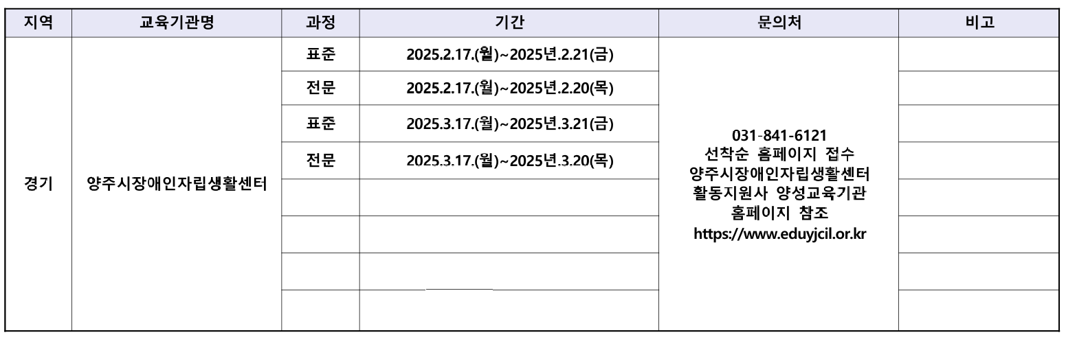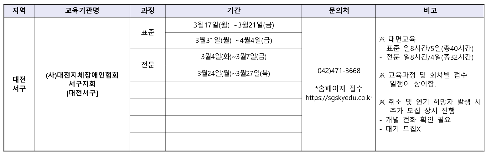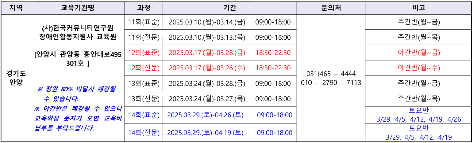 아래는 2025년 3월 전국 장애인활동지원사 교육기관의 교육 일정 모음이다. 해당 일정은 교육기관 사정에 따라 변경될 수 있다.