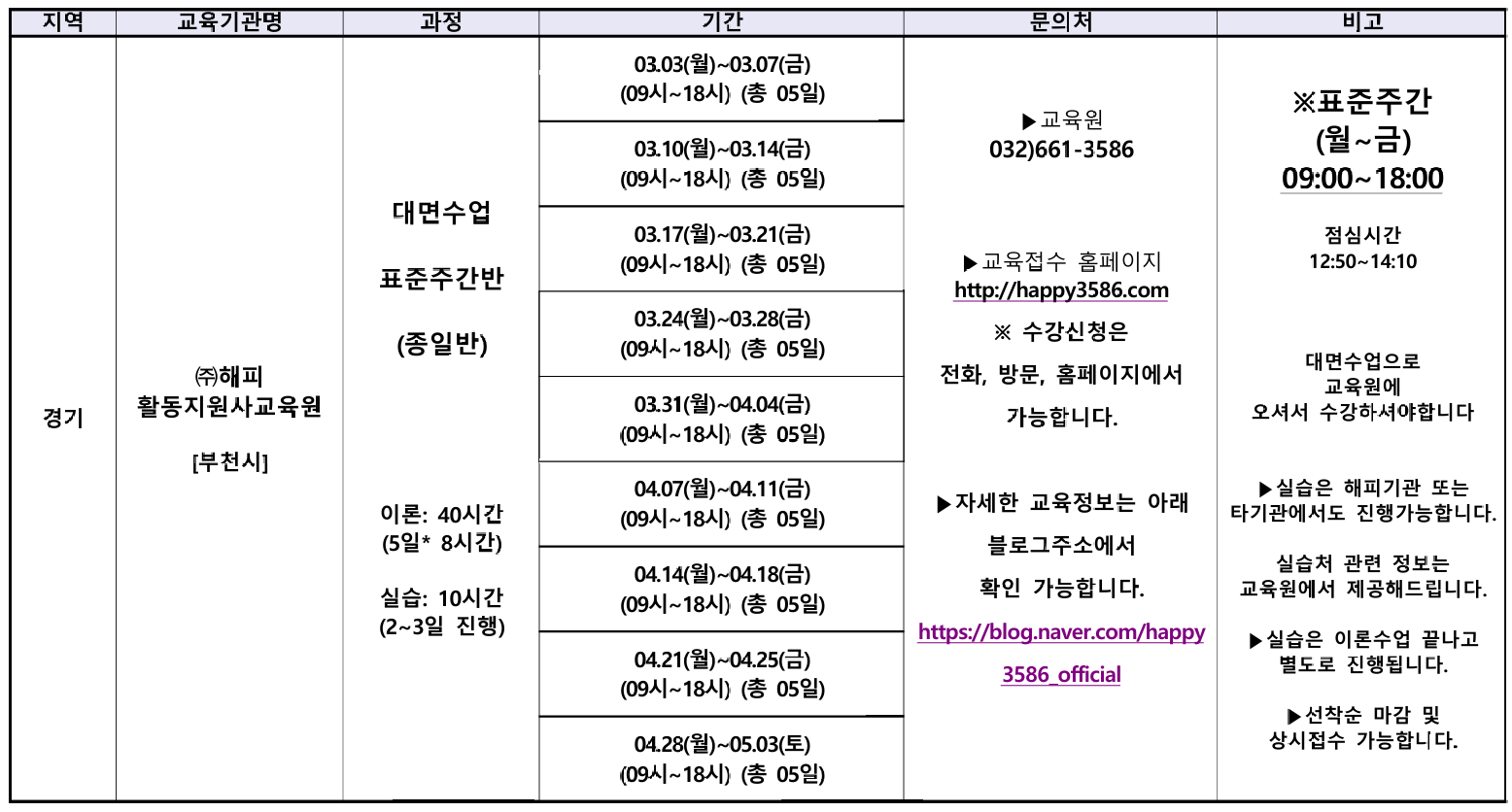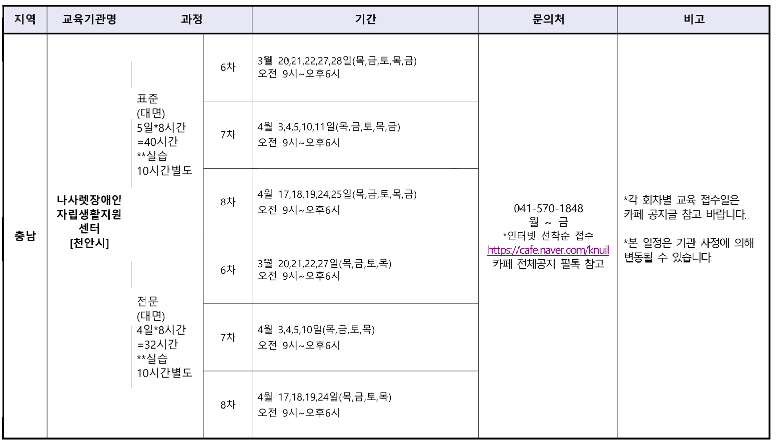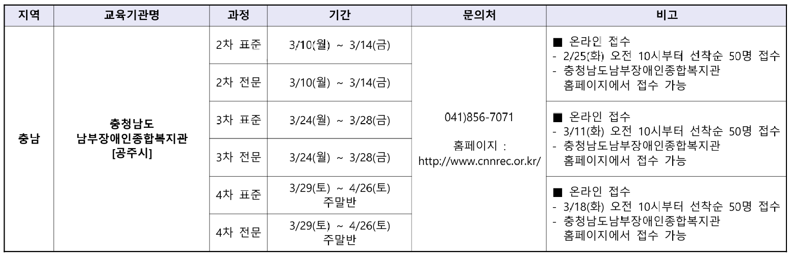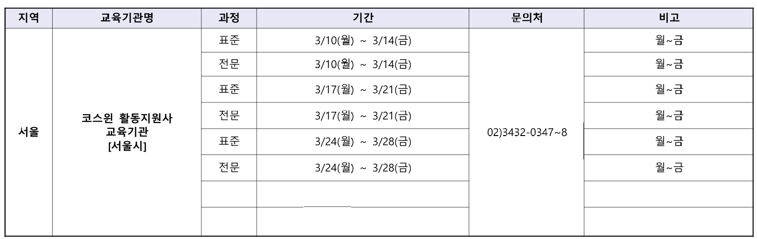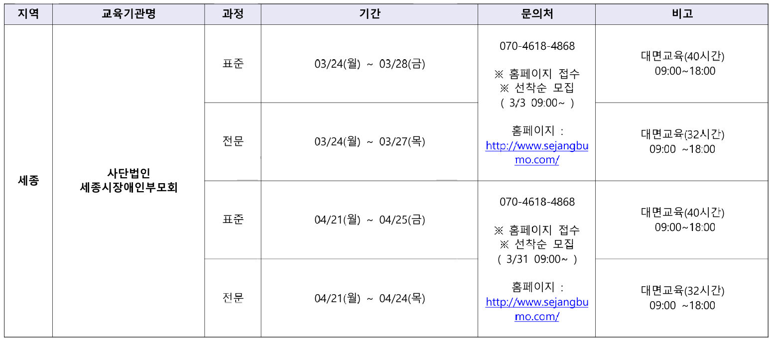 아래는 2025년 3월 전국 장애인활동지원사 교육기관의 교육 일정 모음이다. 해당 일정은 교육기관 사정에 따라 변경될 수 있다.