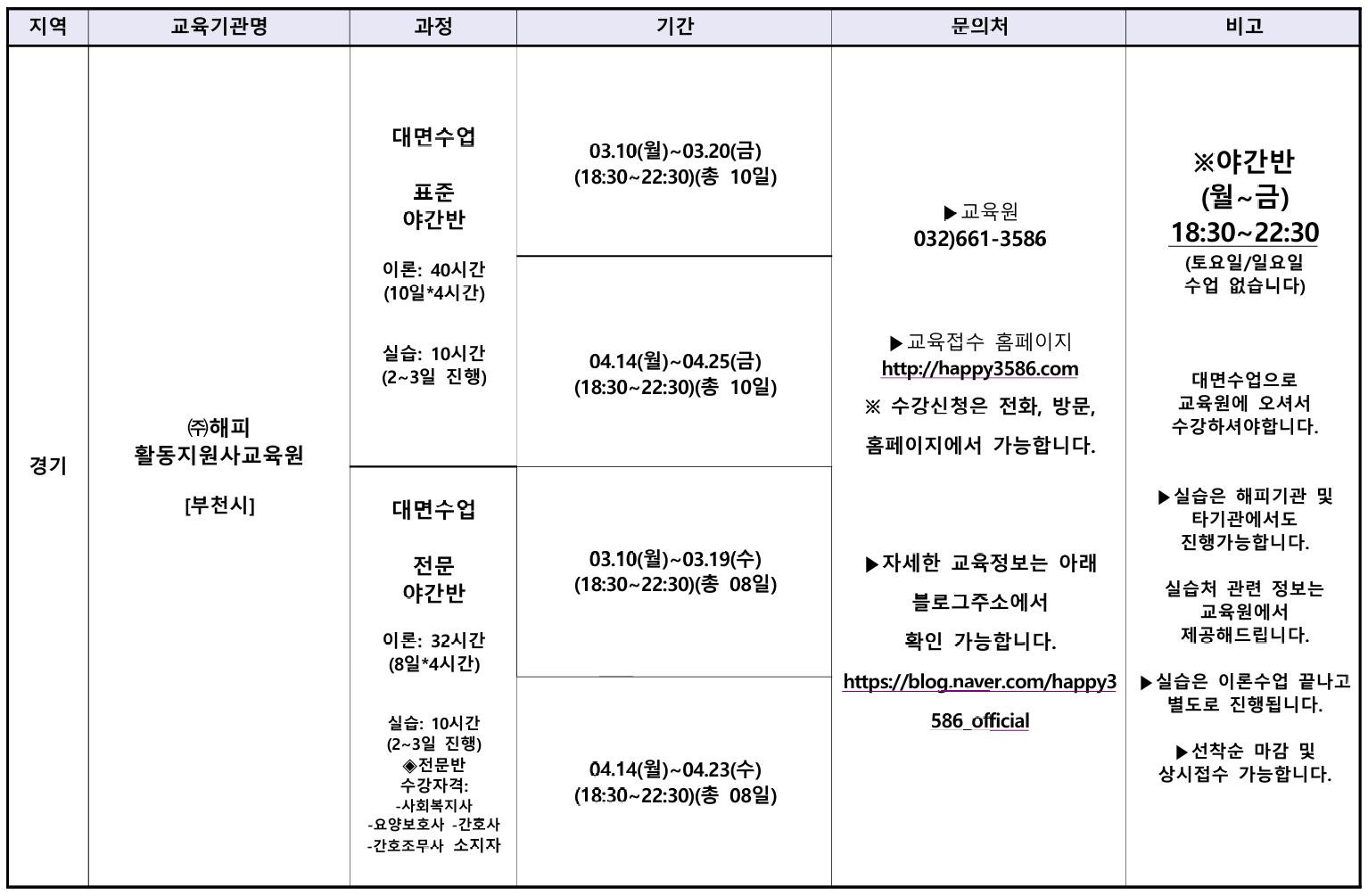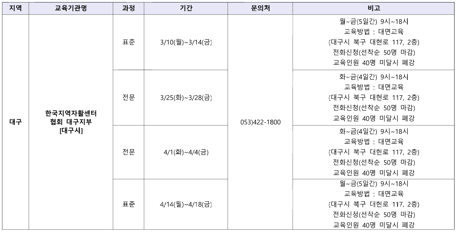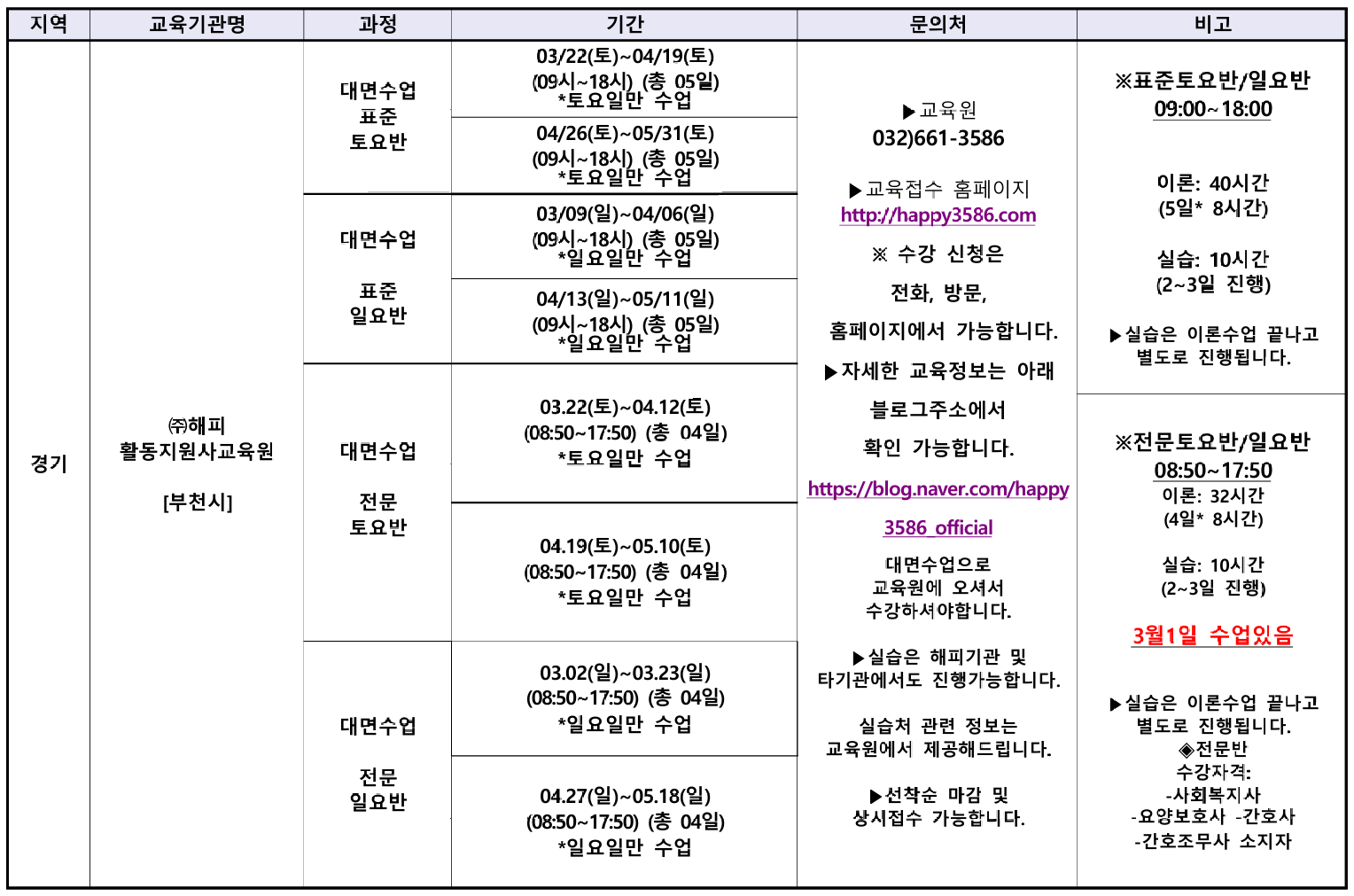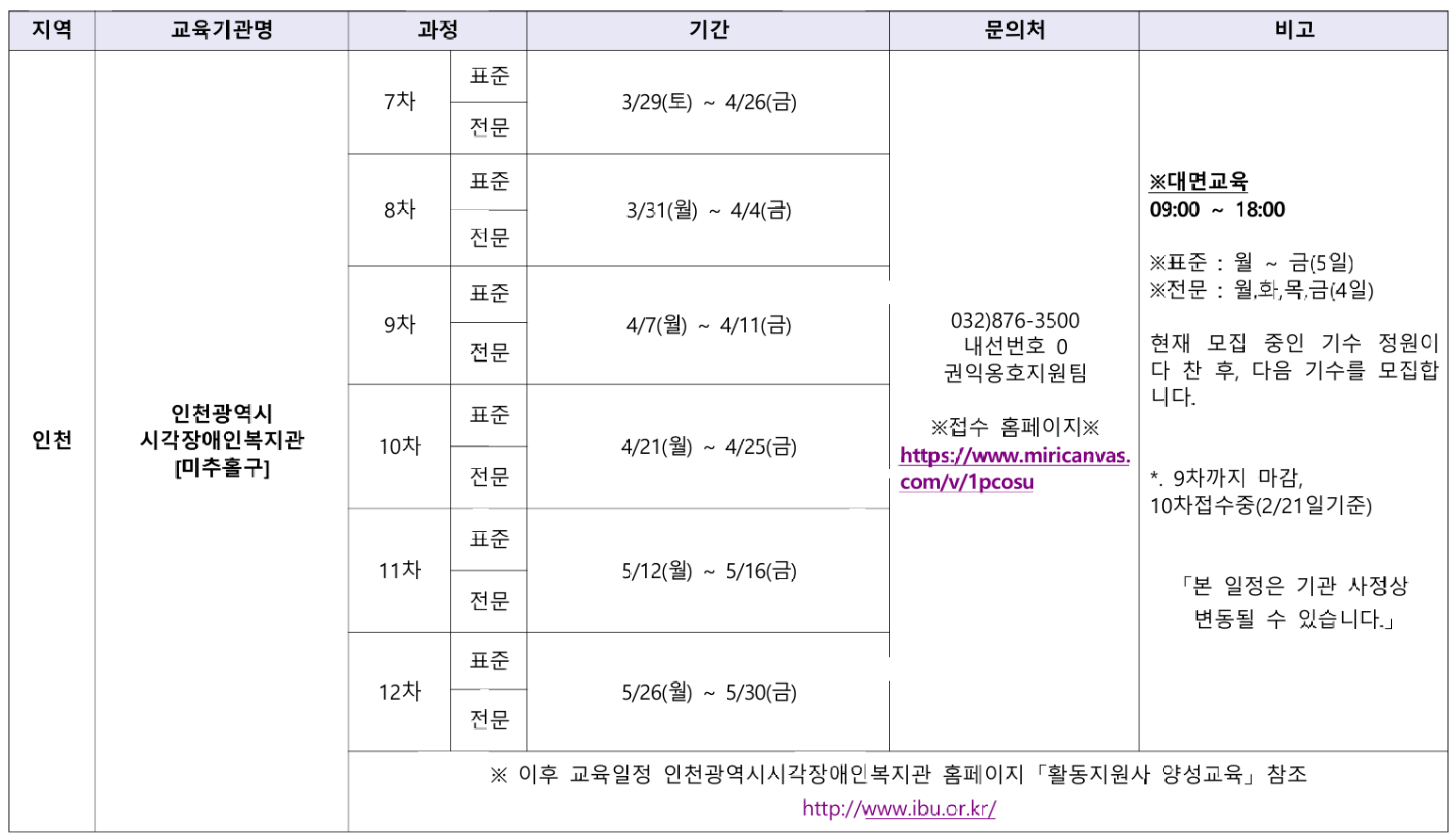 아래는 2025년 3월 전국 장애인활동지원사 교육기관의 교육 일정 모음이다. 해당 일정은 교육기관 사정에 따라 변경될 수 있다.