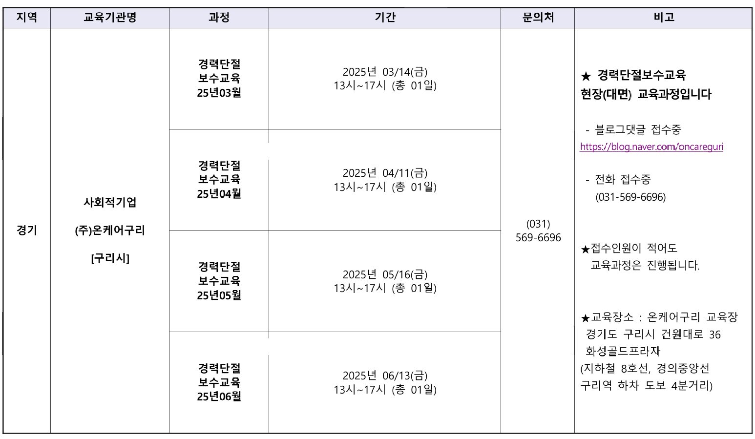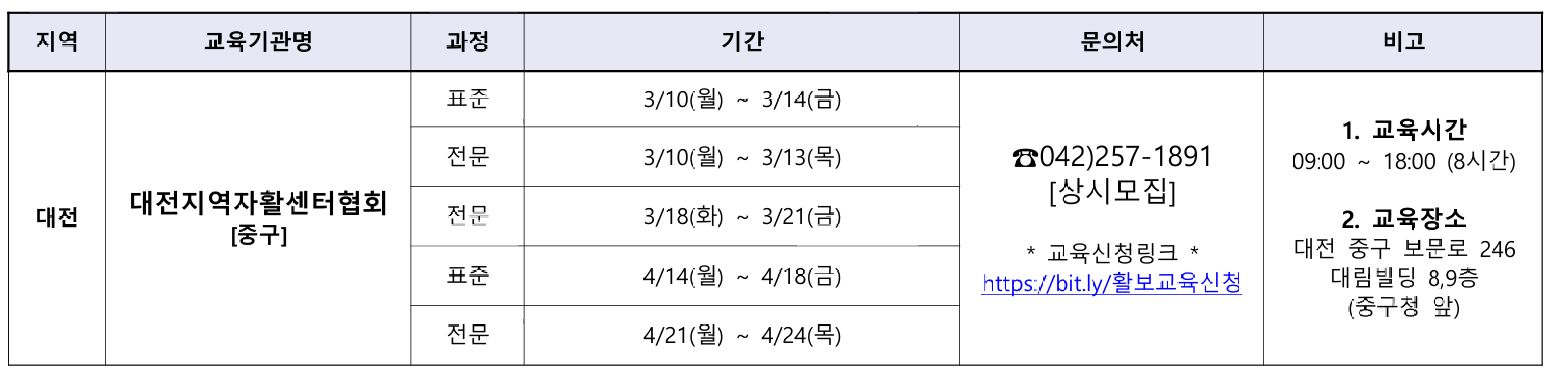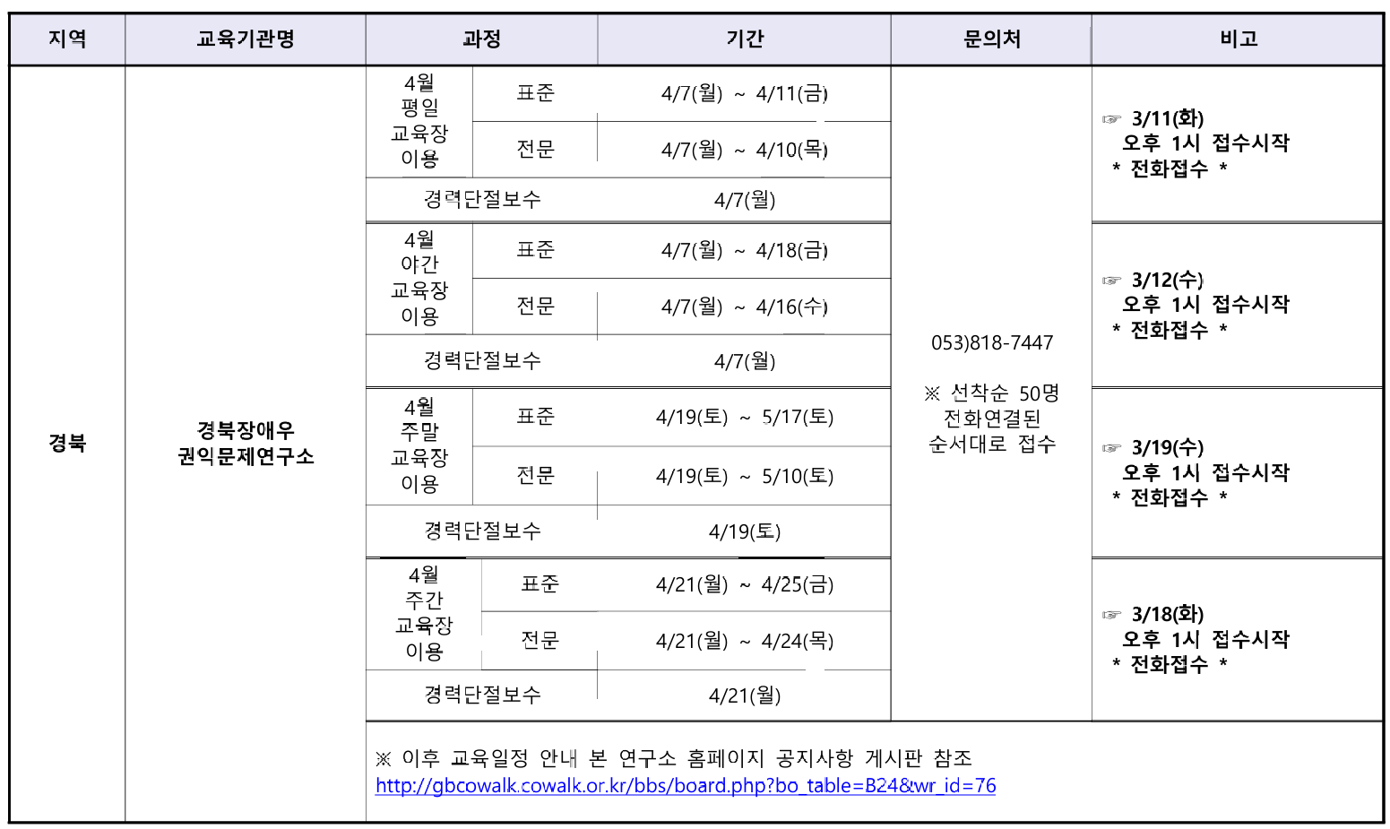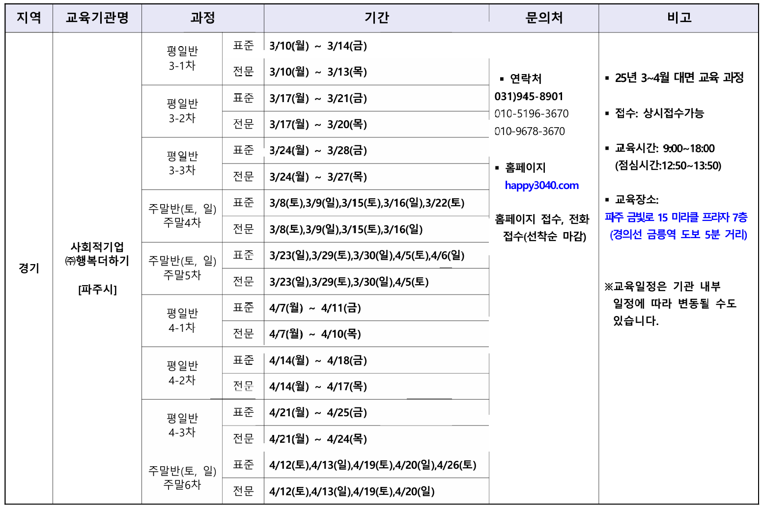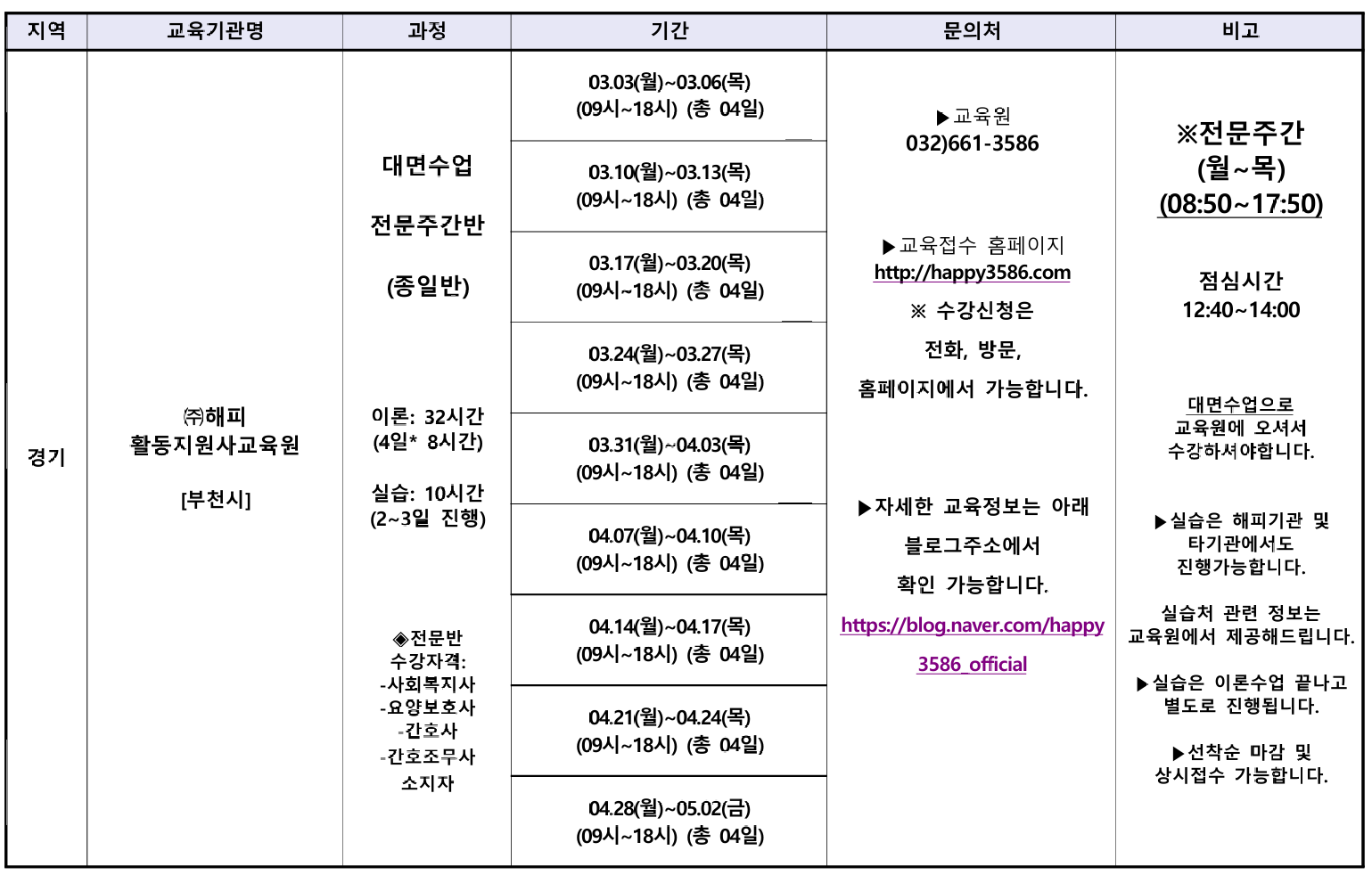 아래는 2025년 3월 전국 장애인활동지원사 교육기관의 교육 일정 모음이다. 해당 일정은 교육기관 사정에 따라 변경될 수 있다.