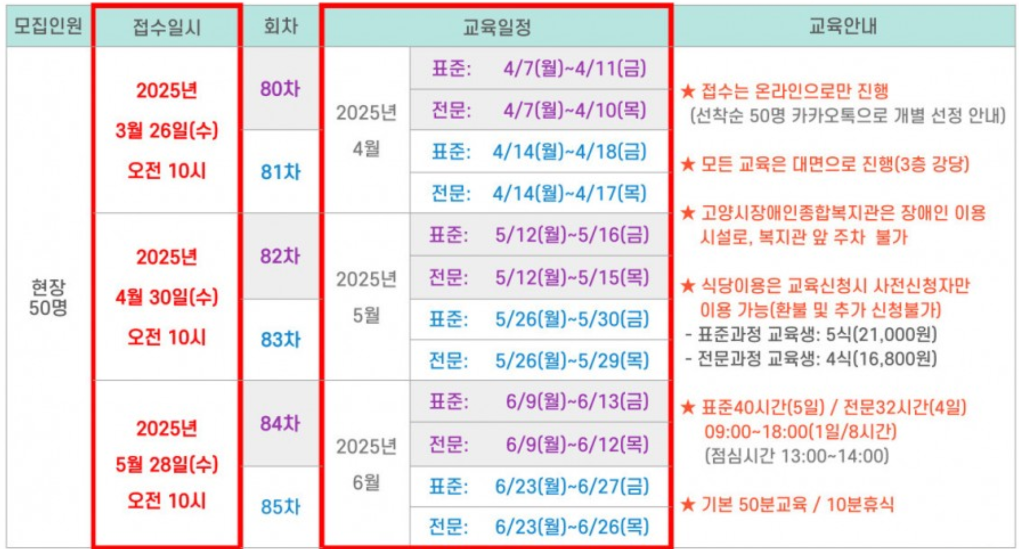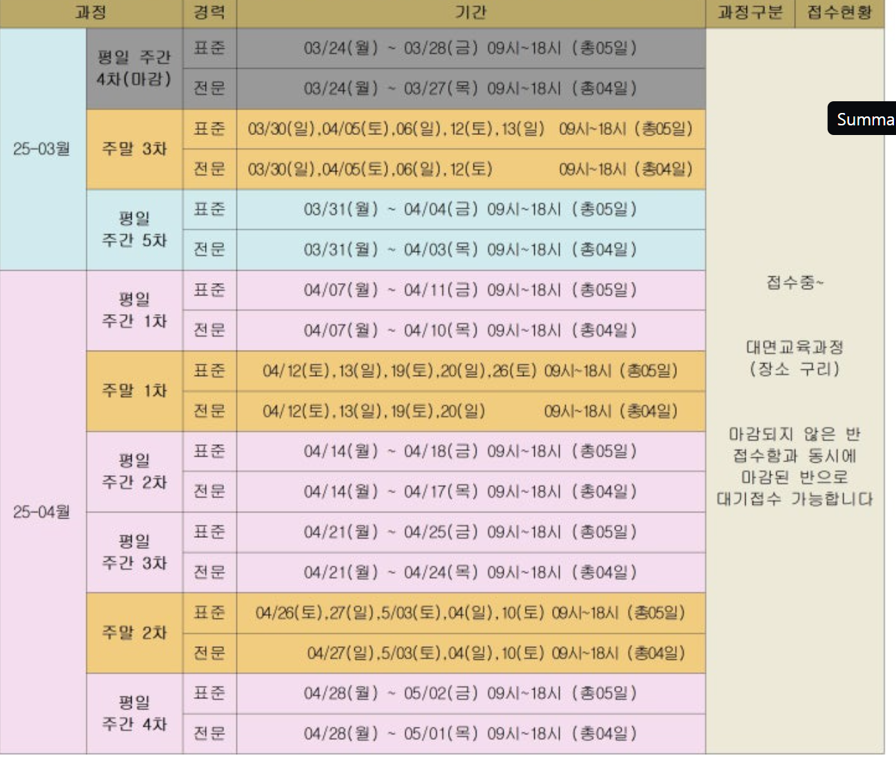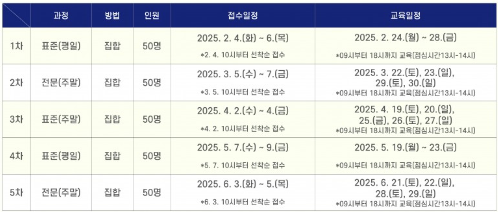 | 11회 | 토요반 4/19 4/26 5/3 5/10 5/17 일반교육 총 5일간 | 토요반 4/19 4/26 5/3 5/10 유사교육 총 5일간 |