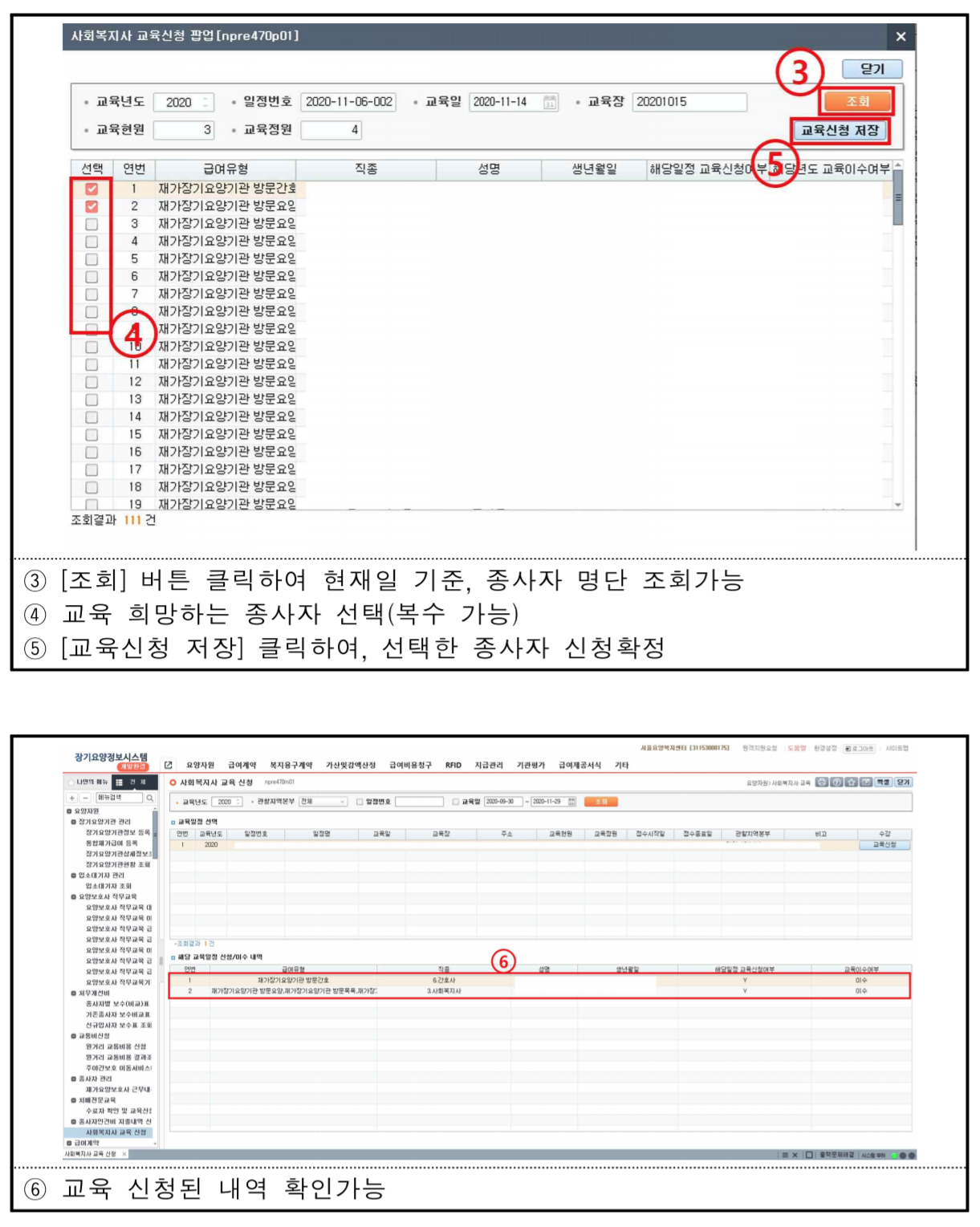5. [교육신청 저장] 클릭하여, 선택한 종사자 신청 확정