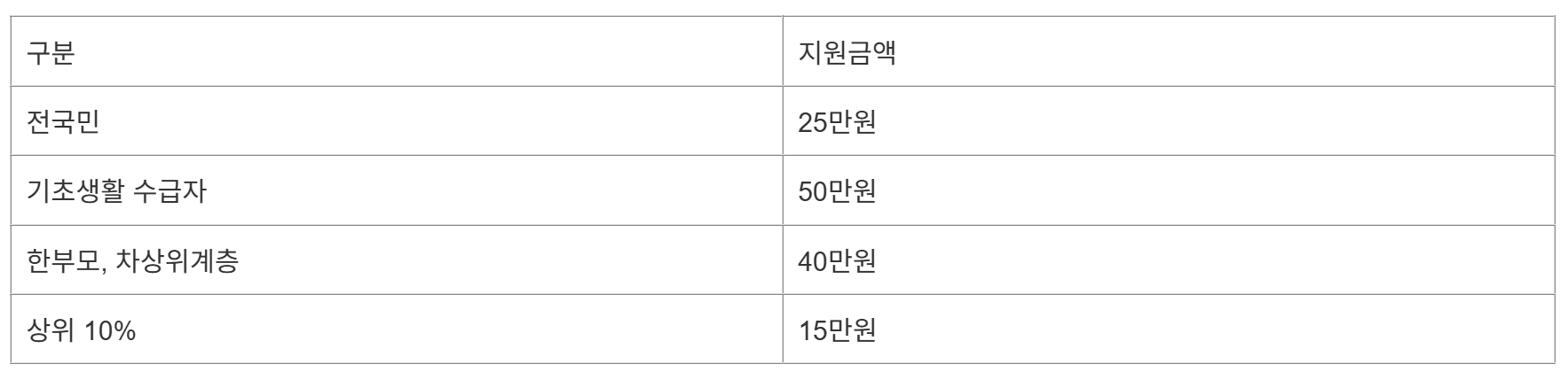 현재 정부와 여당은 모든 국민에게 25만원을 지원하고, 기초생활 수급자 등 취약계층에게는 최대 50만원까지 지급을 확대하는 방안을 검토중에 있는 것으로 알려졌다.