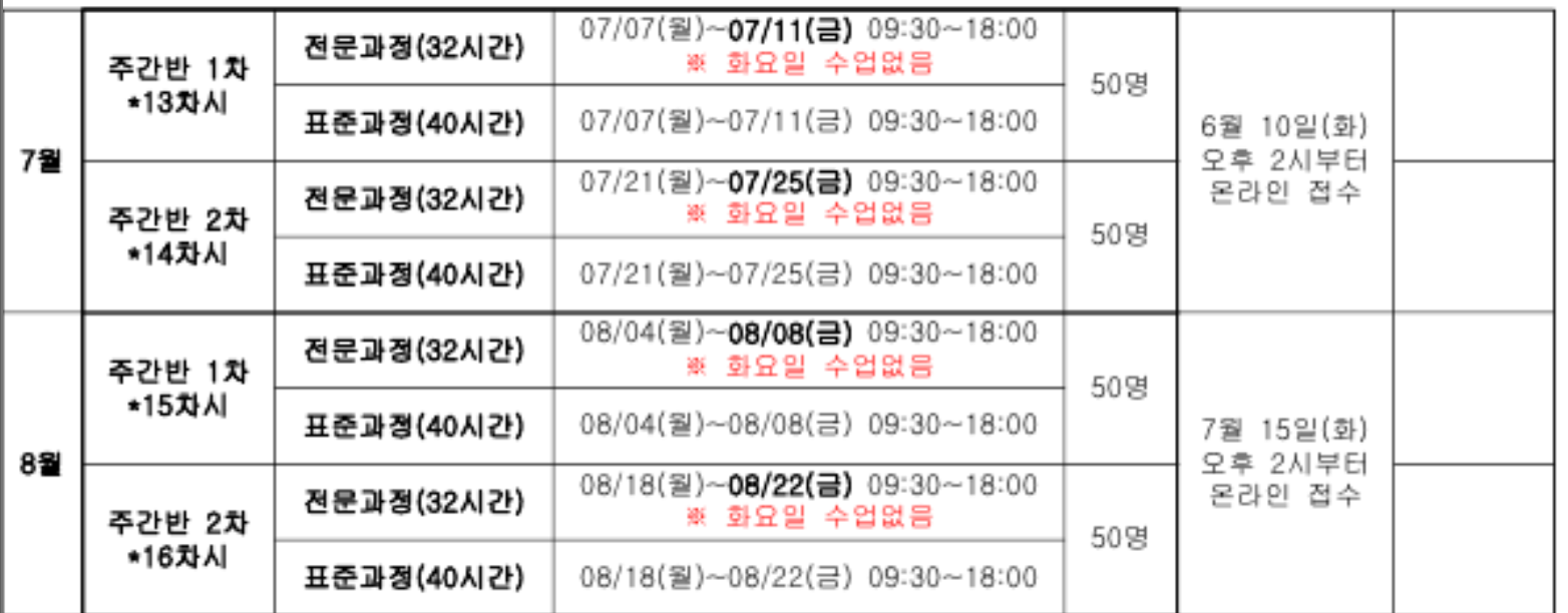 표준과정: 7월 7일(월) ~ 11일(금) / 전문과정: 7월 7일(월) ~ 10일(목) 접수 : 6.1.(일)09:00~ 선착순으로 마감함 |