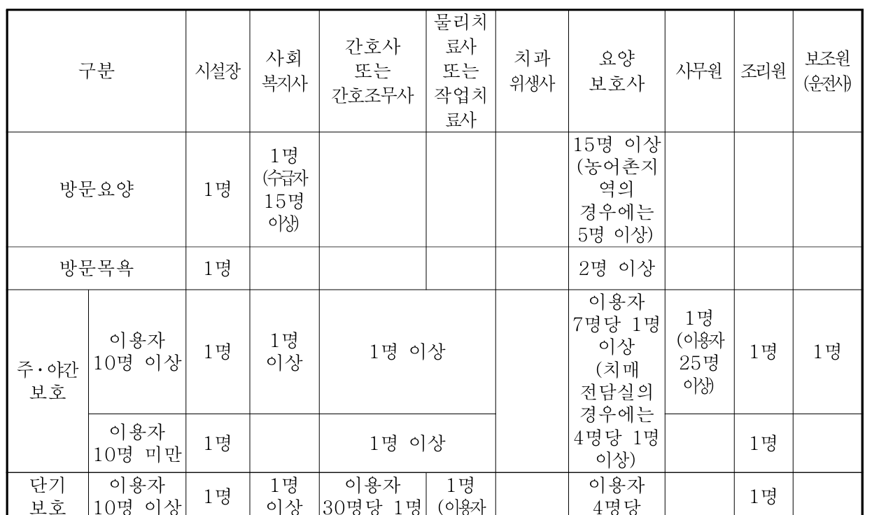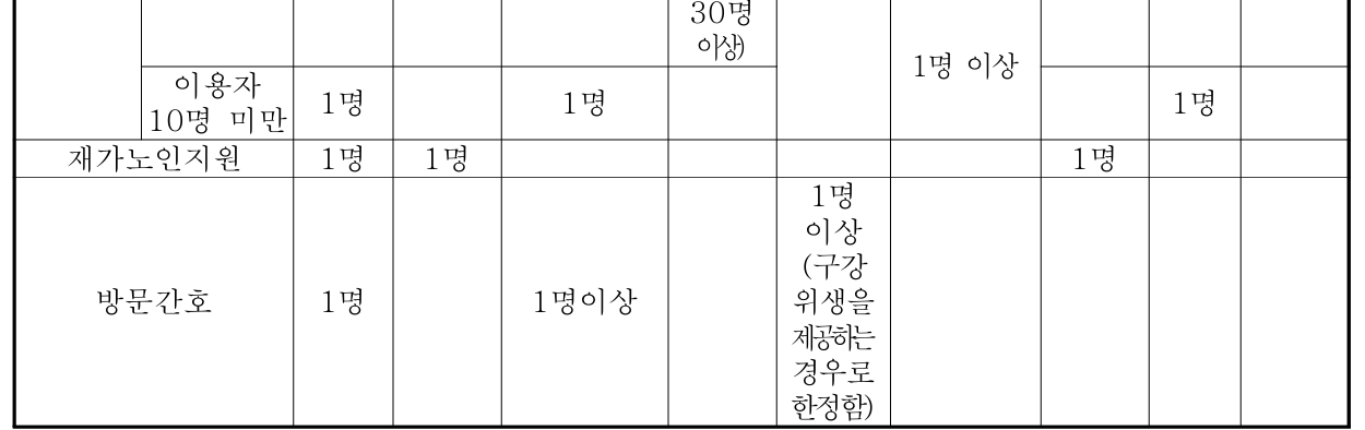 시설 및 인력 배치 기준에 대해서는 재가노인복지시설의 시설기준 및 직원배치기준(제29조제1항 관련)(노인복지법 시행규칙) 자료를 참고해 보자.