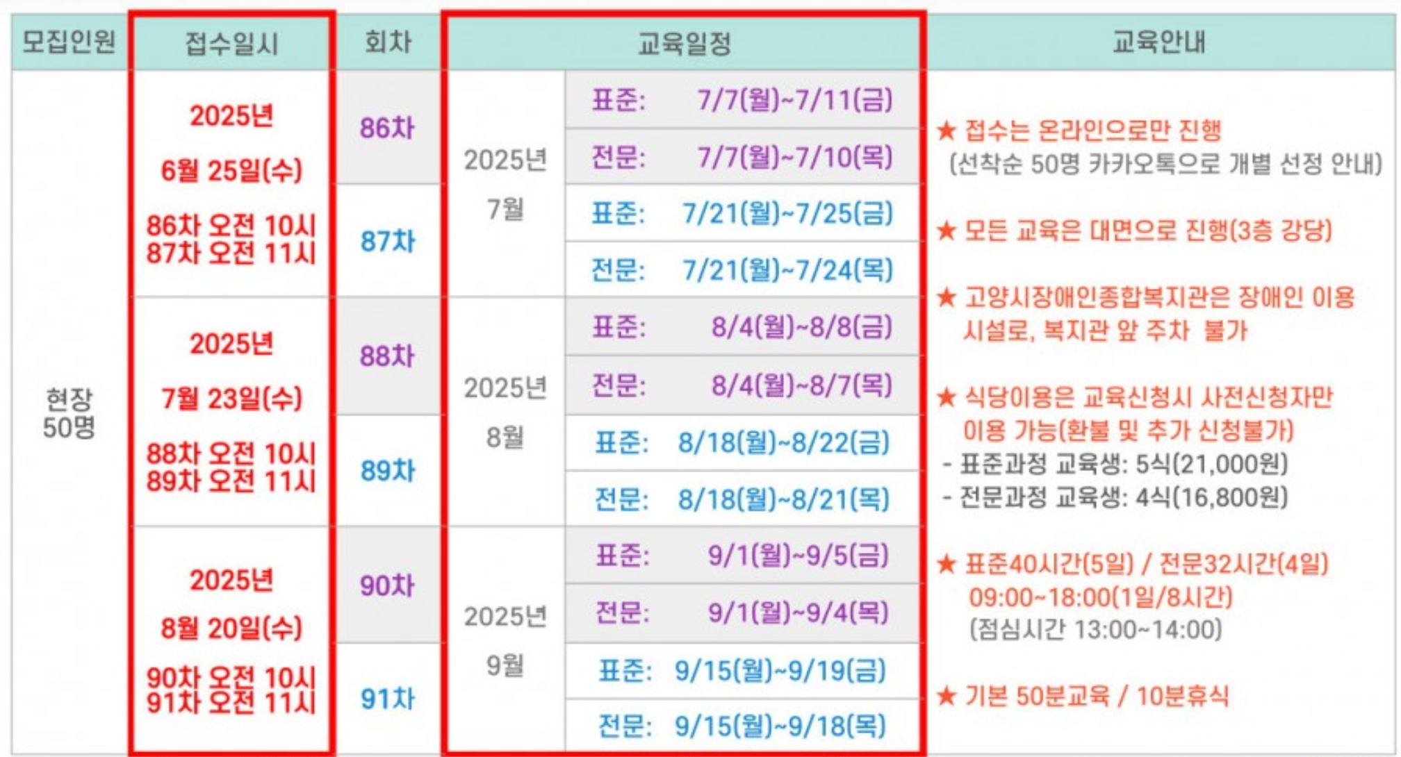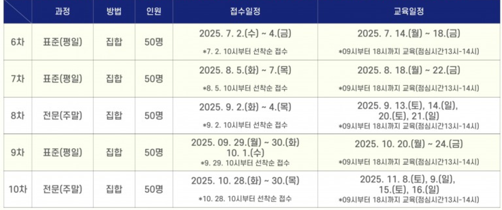 | 24회 | 토요반 9/20 9/27 10/11 10/18 10/25 일반교육 총 5일간 | 토요반 9/20 9/27 10/11 10/18 유사교육 총 4일간 |