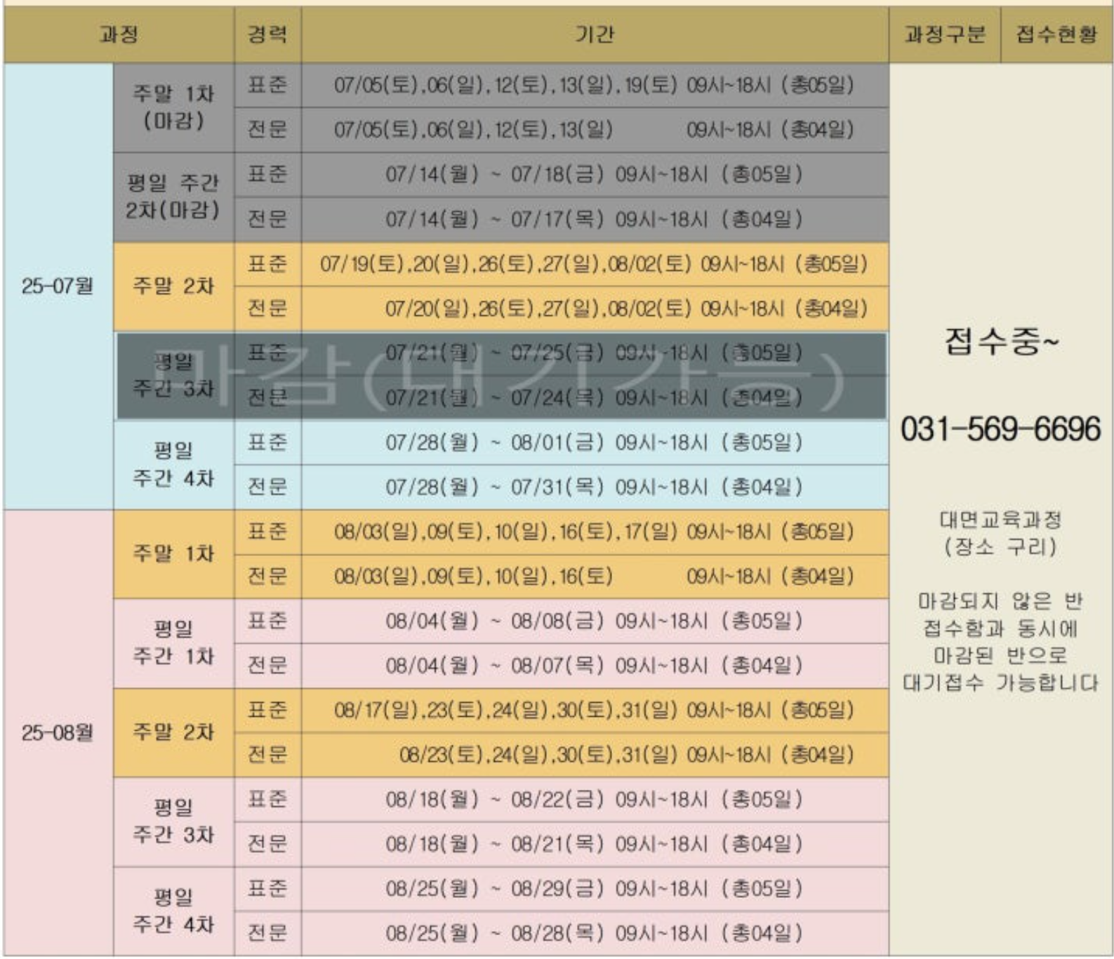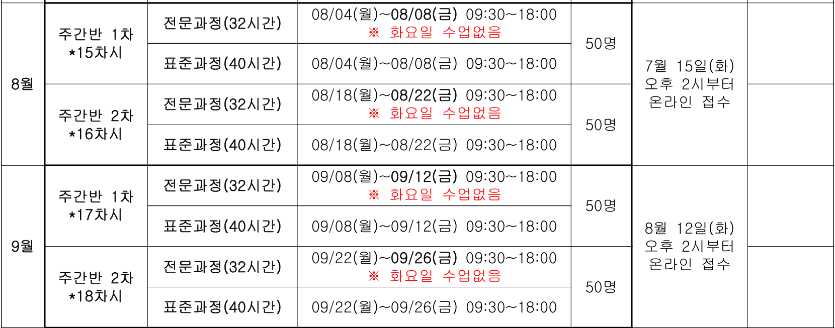 표준과정: 8월 24일(일), 30일(토), 31일(일),9월 6일(토), 7일(일) / 전문과정: 8월 24일(일), 30일(토), 31일(일),9월 6일(토) 접수 : 7.17.(목)09:00~ 선착순으로 마감함 |