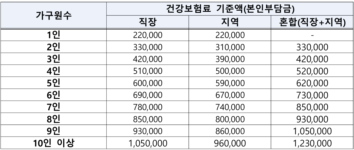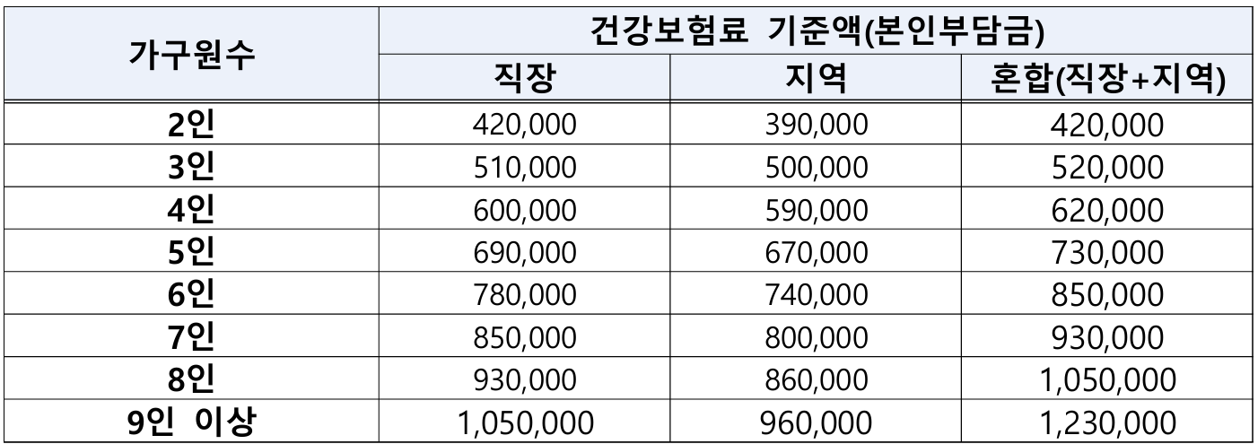○ 다소득원 가구는 ‘가구원 수 + 1명’의 기준액을 적용합니다.- 예를 들어, 직장가입자 2인이 포함된 4인 가구라면 직장가입자