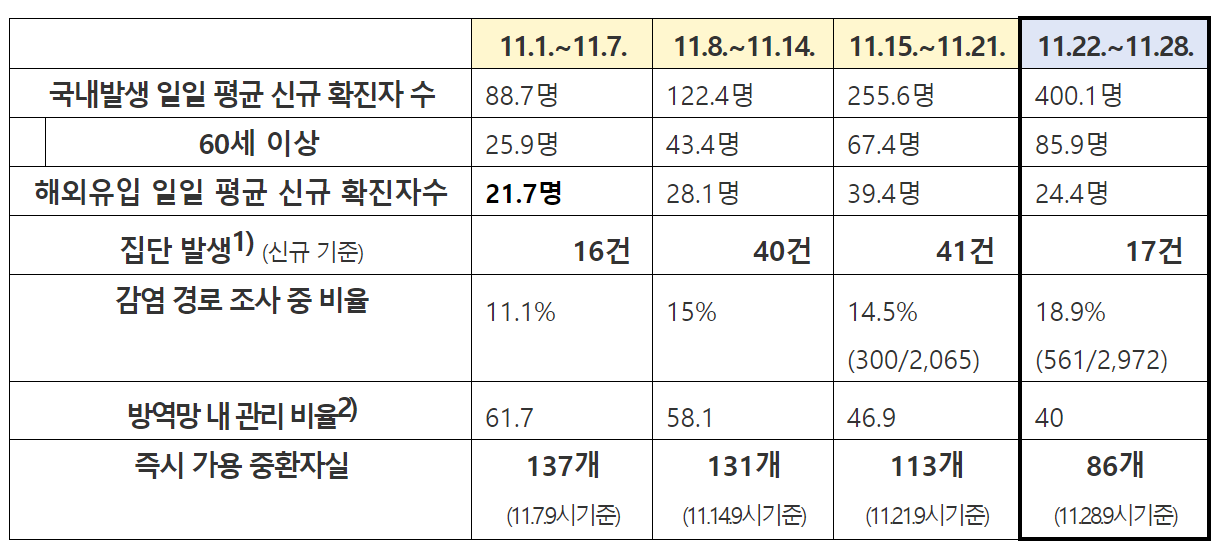11월 22일부터 11월 28일 사이 일일 평균 확진자수가 400명 수준이 이르렀다.