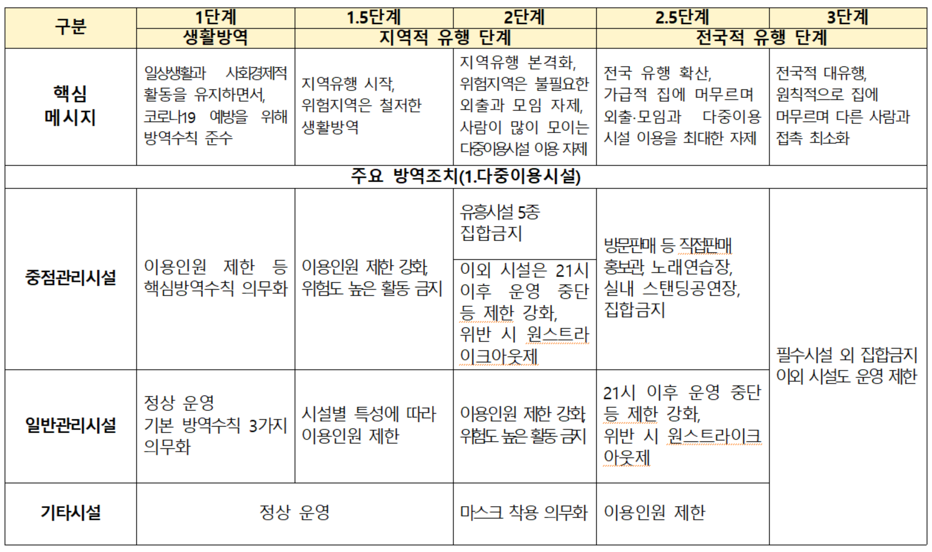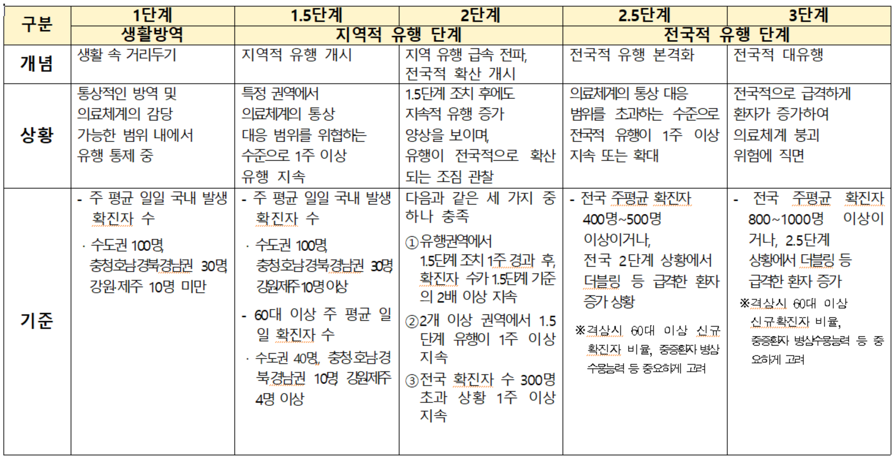 거리두기 단계별 기준 및 방역 조치 (요약)