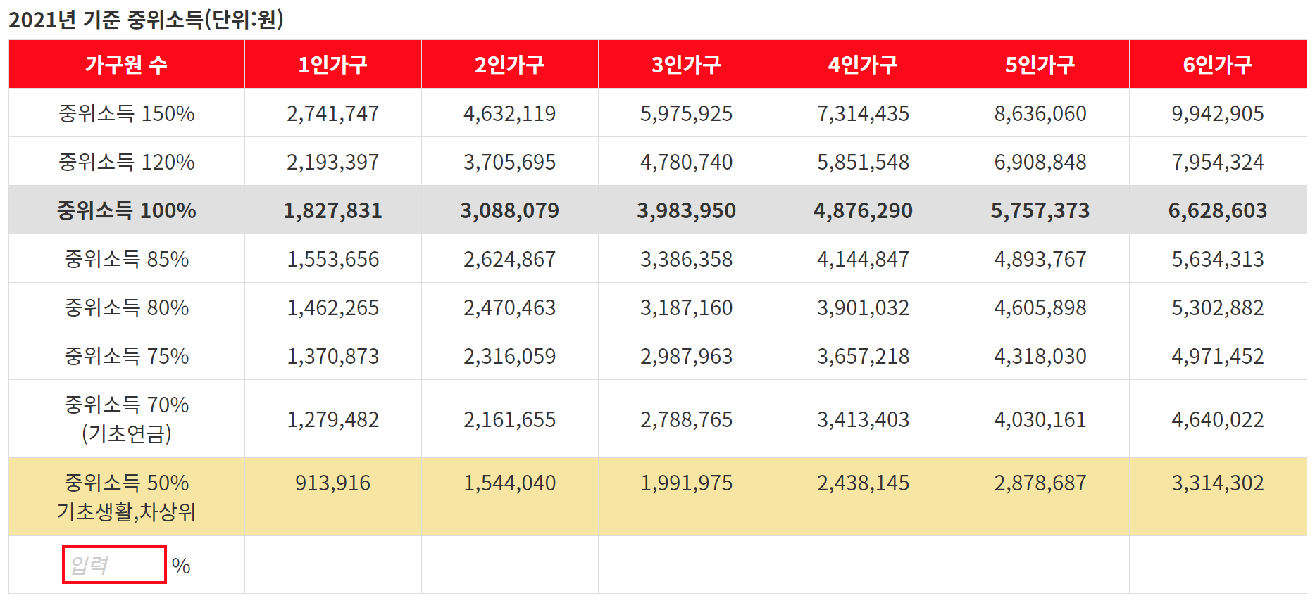 중위소득 퍼센트(%)만 입력하면 자동으로 계산해 주는 기능도 추가했다.