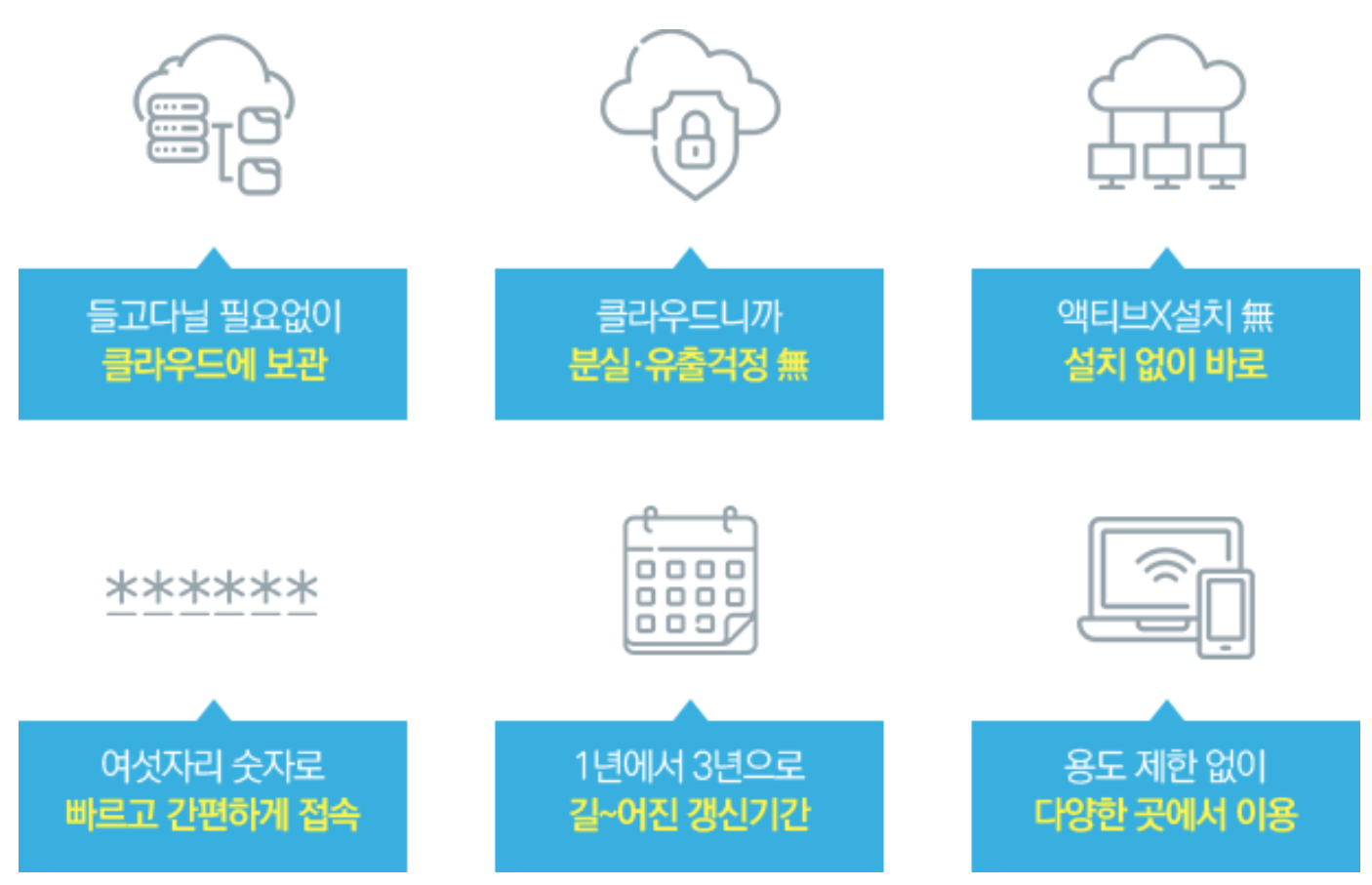 별도의 설치가 필요 없고 한번 발급받으면 모든 은행과 정부 민원 서비스 등에 이용할 수 있다.