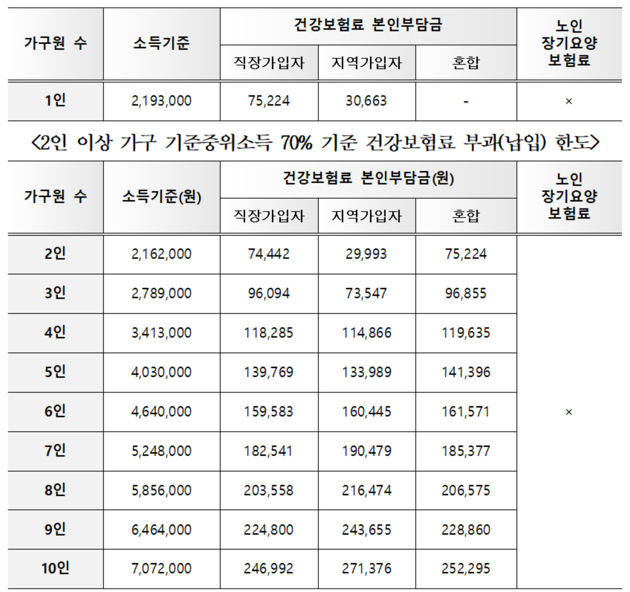 <1인 가구 기준중위소득 120% 기준 건강보험료 부과(납입) 한도>