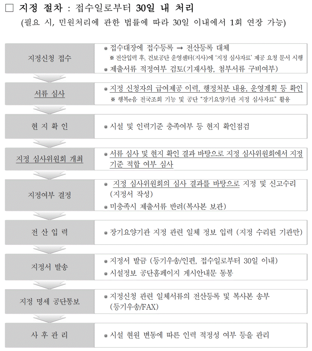 재가장기요양기관 설치신고서 및 서류 제출 ( 시군구 노인복지과 담당자 ) -> 유기한 민원접수(7일내) -> 서류검토(시설 및 인력기준) -> 현장실사 -> 설치신고필증 교부