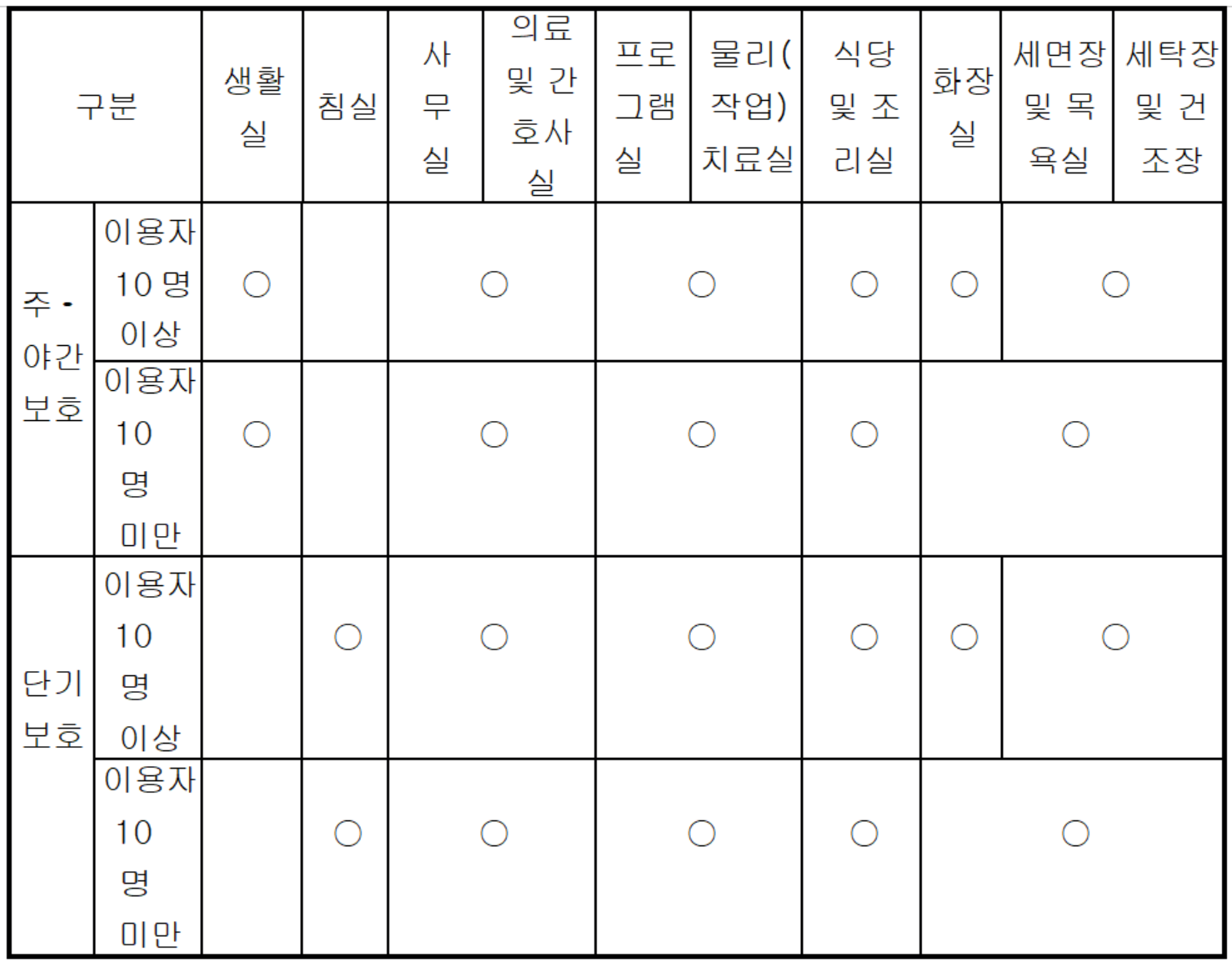 1. 주·야간보호 이용자가 10명 이상인 경우, 사무실과 의료 및 간호사실은 공 간을 함께 사용할 수 있으나 각각의 시설에 대한 기능은 모두 갖추고 있어야 한 다.