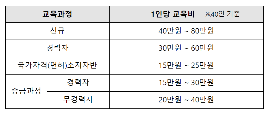 교육 기간은 보통 1달, 야간반은 2달 정도 소요되며 국가자격증 소지자는 주간반 5일, 야간반 10일 정도 소요됩니다.