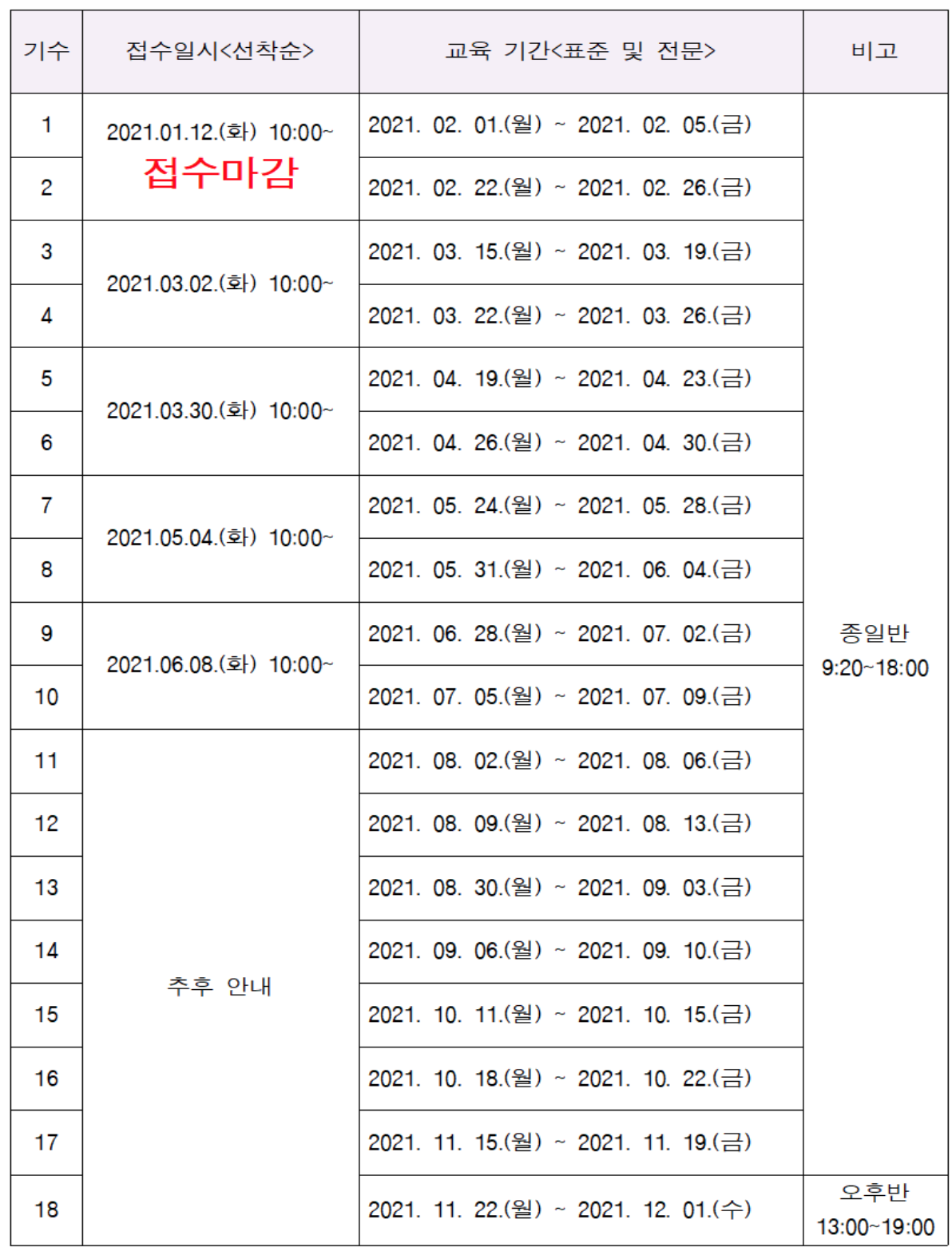총 18 기수로 나눠졌으며 2월까지 교육은 접수 마감되었다.