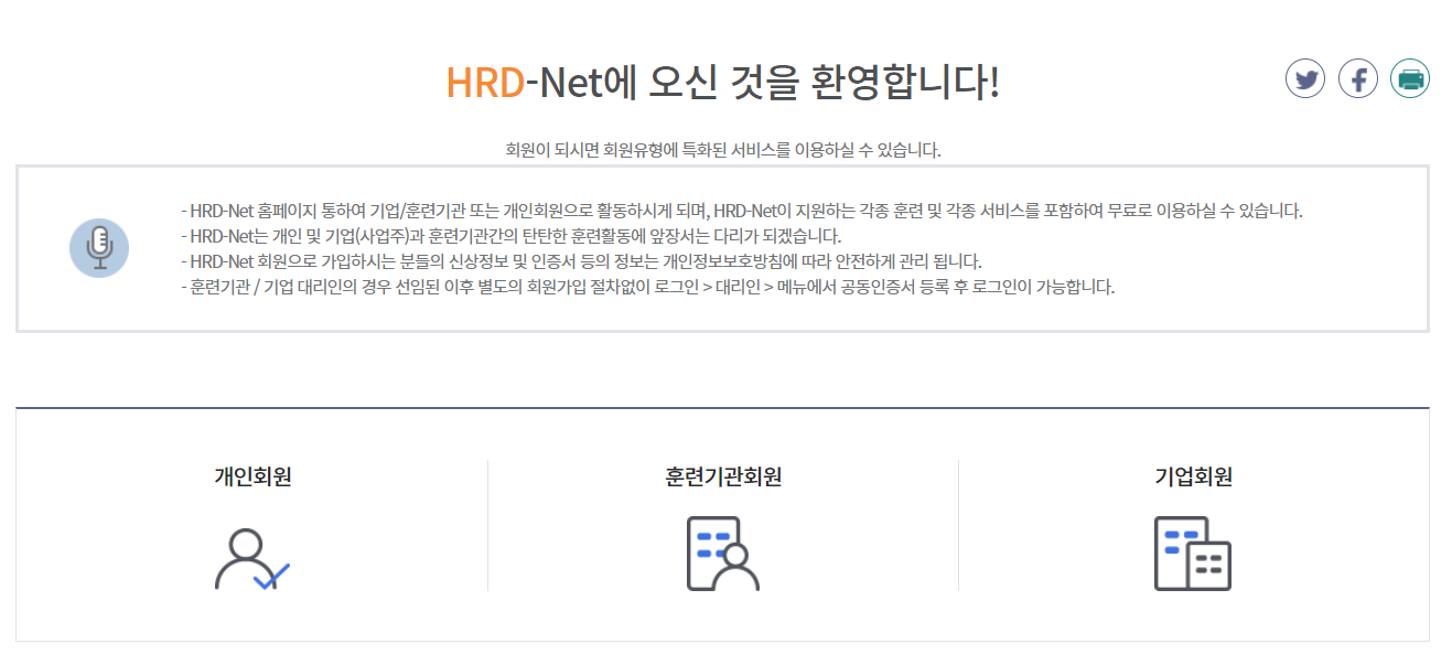 HRD넷에 접속을 하면 상단에 회원가입 메뉴가 있다.