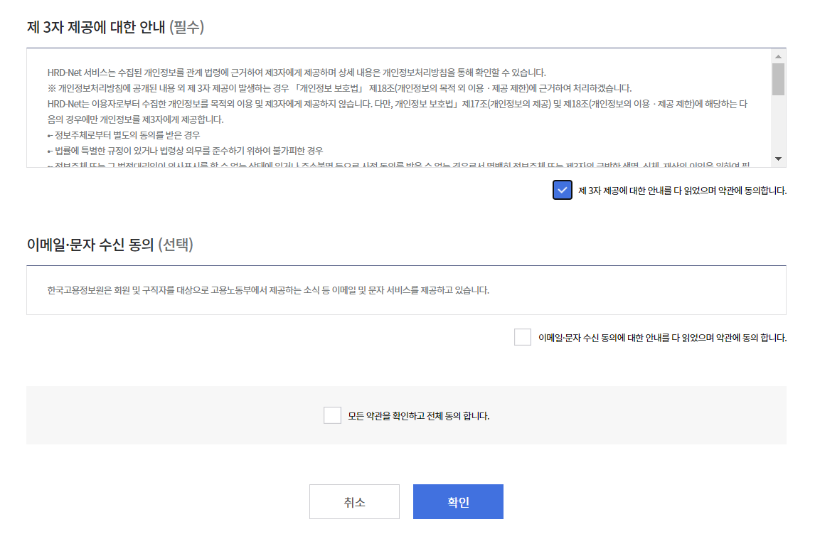 필수 동의는 꼭 선택해야 하고 선택 동의는 체크박스를 선택하지 않아도 된다.