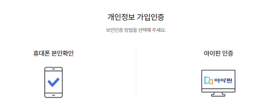 가입에 따른 개인정보 가입 인증하게 되어 있다. 아이핀이 있다면 아이핀 선택을 하고 없다면 휴대폰 인증으로 진행하자
