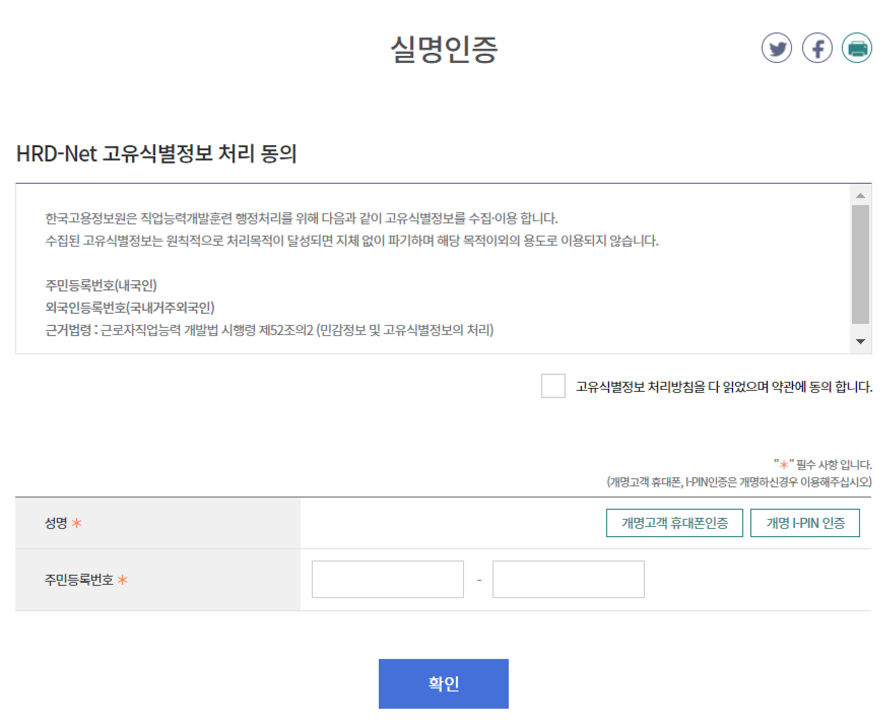 국민내일배움카드를 신청할 때 다시 한번 실명 인증을 요구한다.