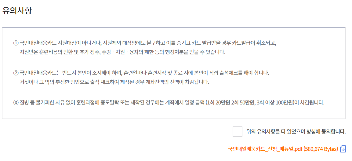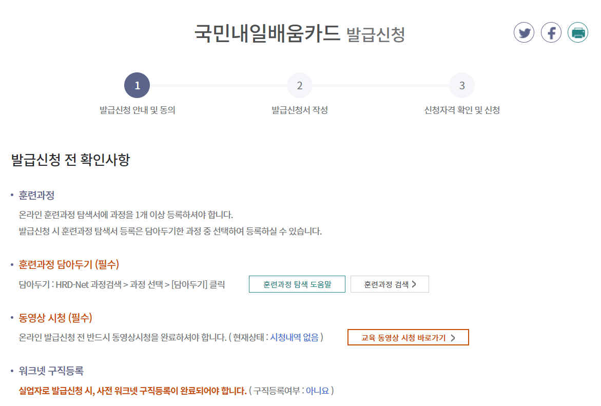발급 신청 전에 꼭 확인해 두어야 할 사항이 있다. 워크넷 발급 신청 시 워크넷에 사전 구직 등록은 필수이다. 동영상 시청 및 훈련과정 담아두기 등 필수 과정이 있다.