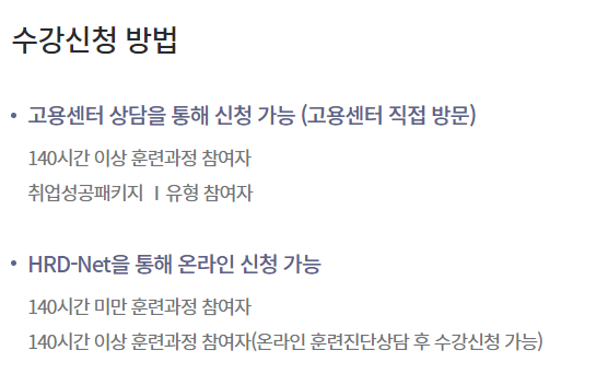 국비지원은 내일배움카드를 통해서 이루어지는데 고용노동부 홈페이지 ( www.hrd.go.kr/ / 고객상담센터 : 1350 )에서 신청이 가능하다.