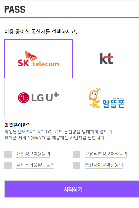 휴대폰 인증은 산택하면 아래와 같은 통신사 선택 화면이 뜬다. 동의 버튼을 선택 후 시작하기 버튼을 누른다.
