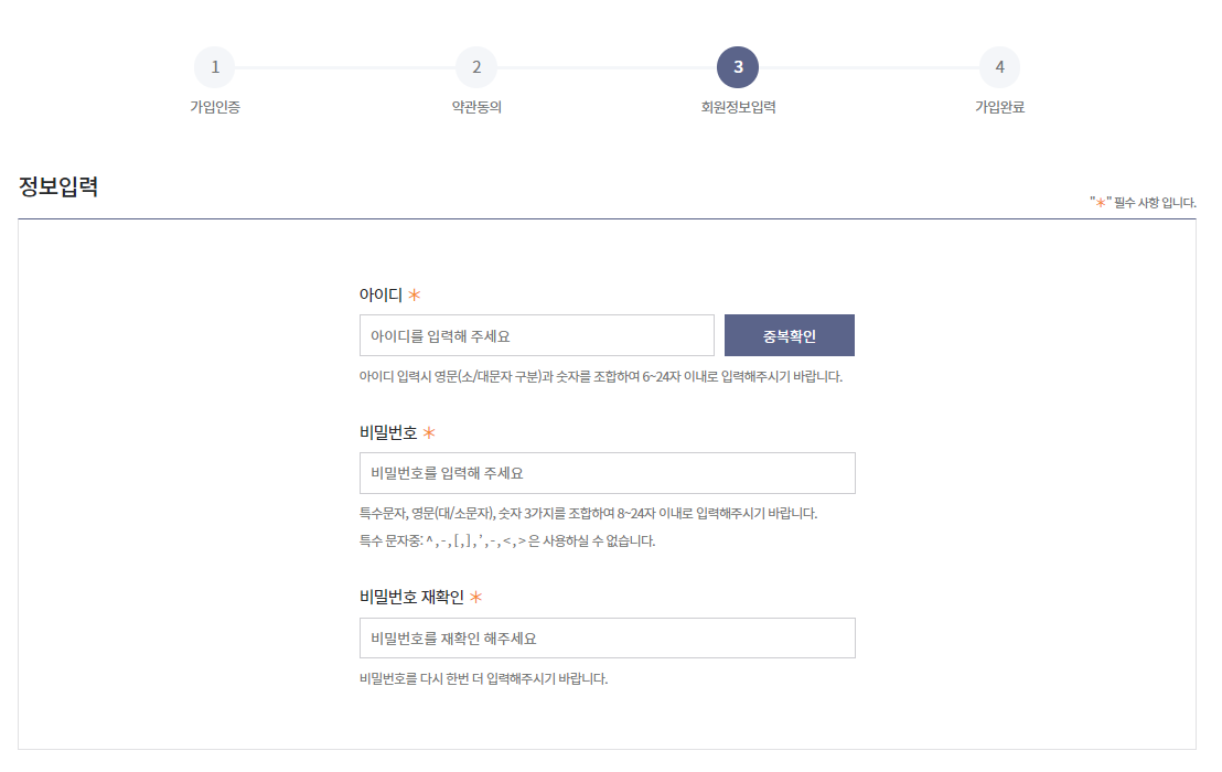 본인인증 동의가 끝나면 가입에 따른 회원 정보 입력하는 부분이 나온다.