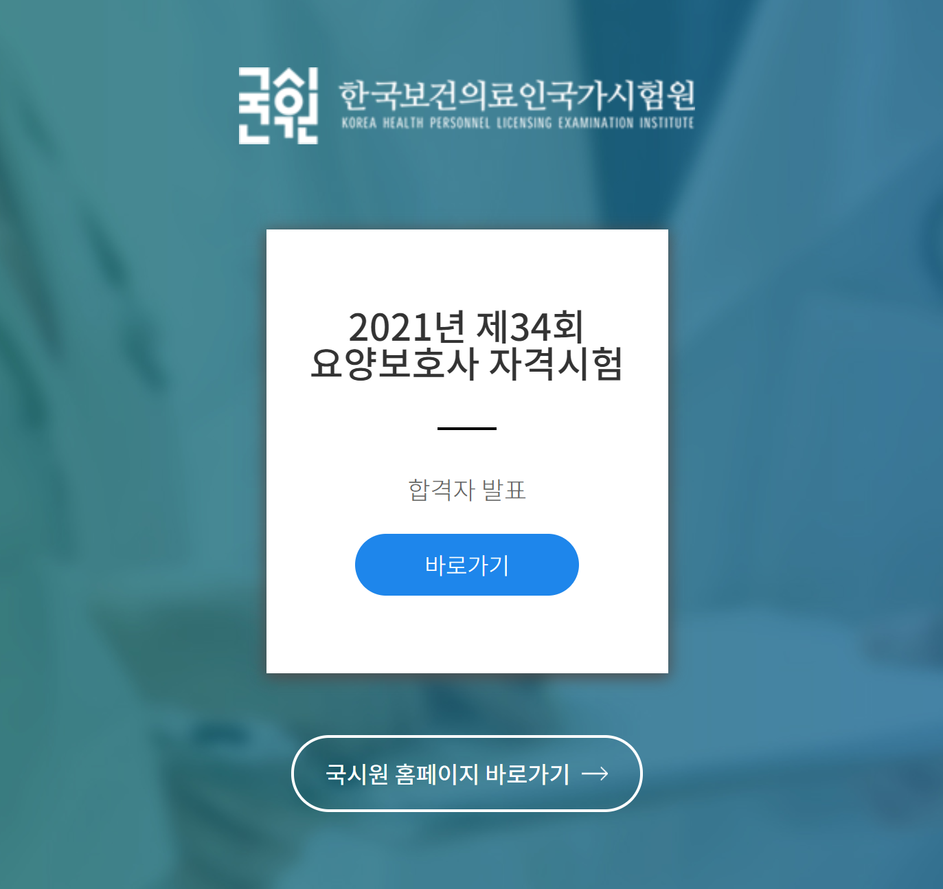 한국보건의료인국가시험원 홈페이지에 접속하면 요양보호사 합격자 확인을 위한 임시 페이지가 뜬다.