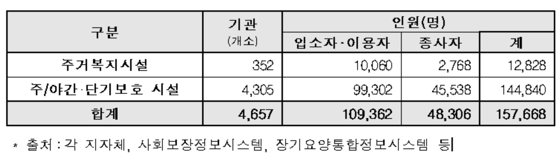 - 노인 시설 (주거, 주/야간, 단기보호) |