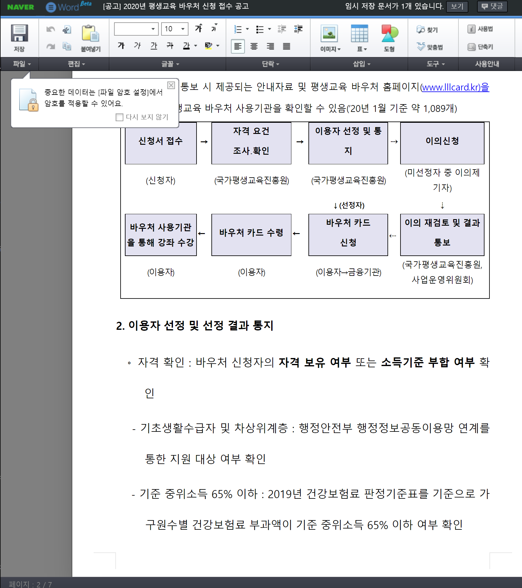 네이버 오피스는 hwp 파일 뿐 아니라 doc, docx 등 MS 파일도 지원하며 수정이 가능합니다.