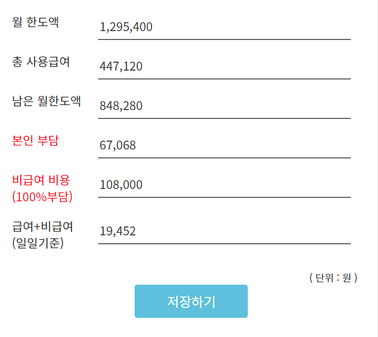 마지막으로 본인부담률을 선택해 주면 실시간으로 이용요금을 계산해 준다.