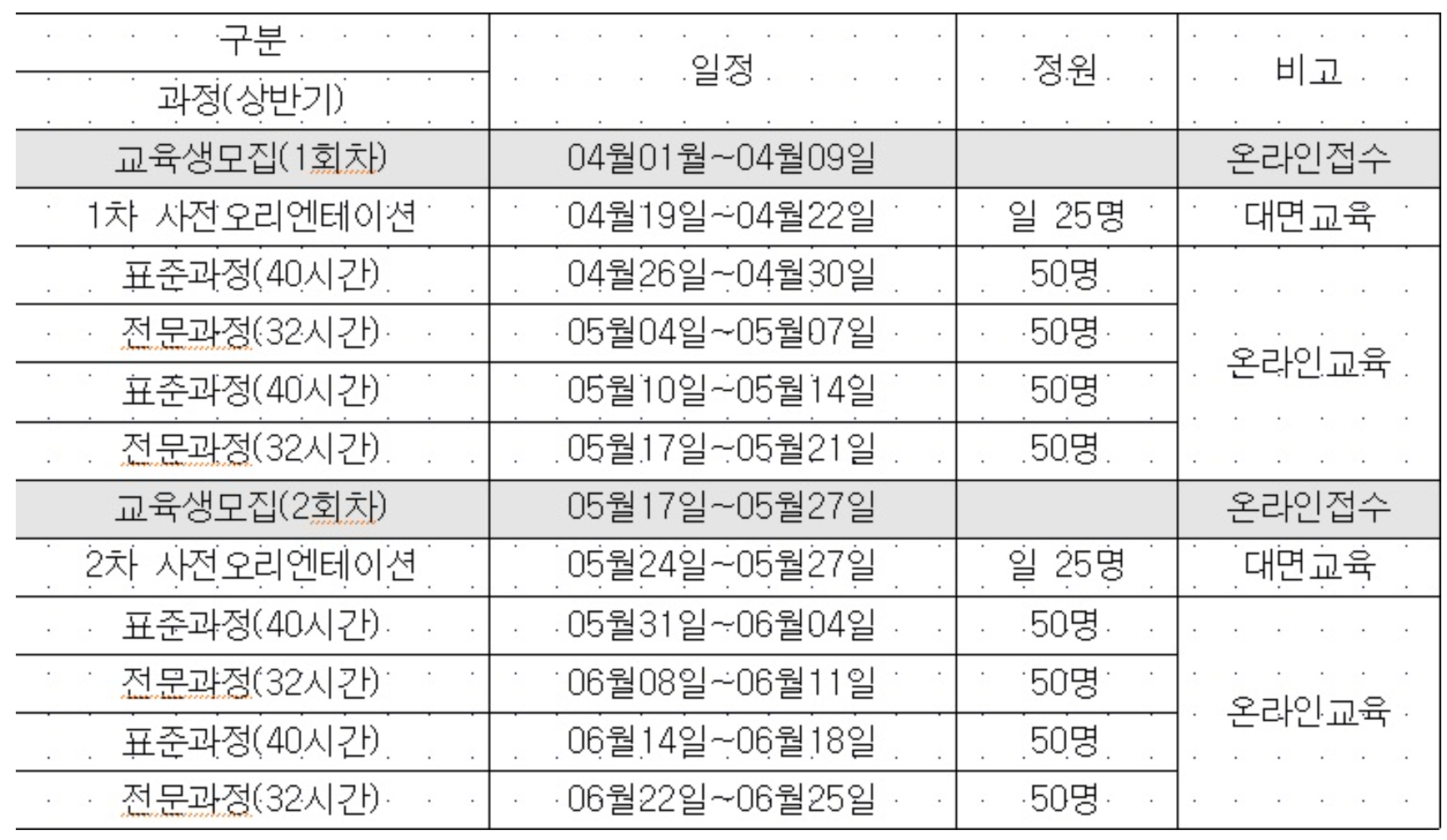 각 과정당 교육 인원은 50명 선착순이며, 교육 모집 마감 후 교육비와 신청서류 등을 개별 문자 안내 받을 수 있다.