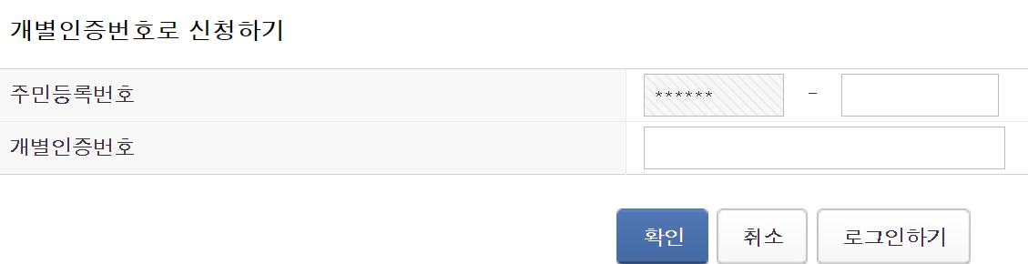 간편신청하기를 누르면 주민등록번호와 문자로 온 개별인증번호를 입력한다.