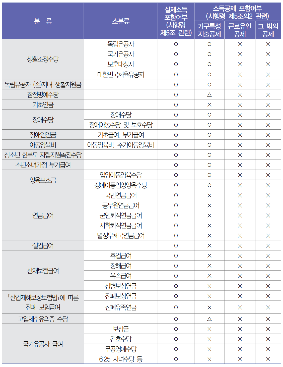 공적이전소득」 범위 및 가구특성지출비용 요약