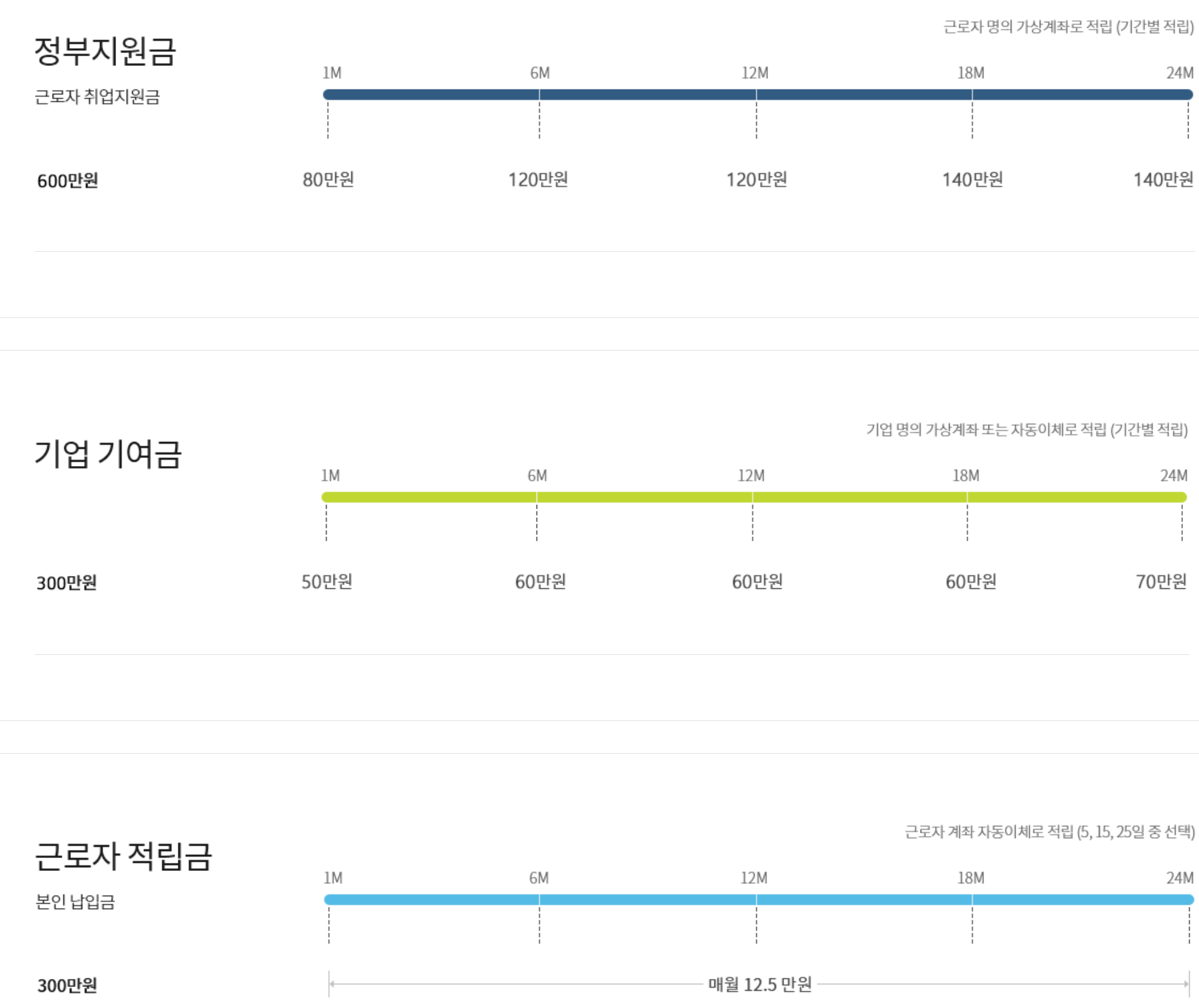 청년 본인은 2년간 300만원(매월 12만 5천원)을 적립하고 기업에서 300만원, 정부에서 600만원을 공동으로 적립해 준다.