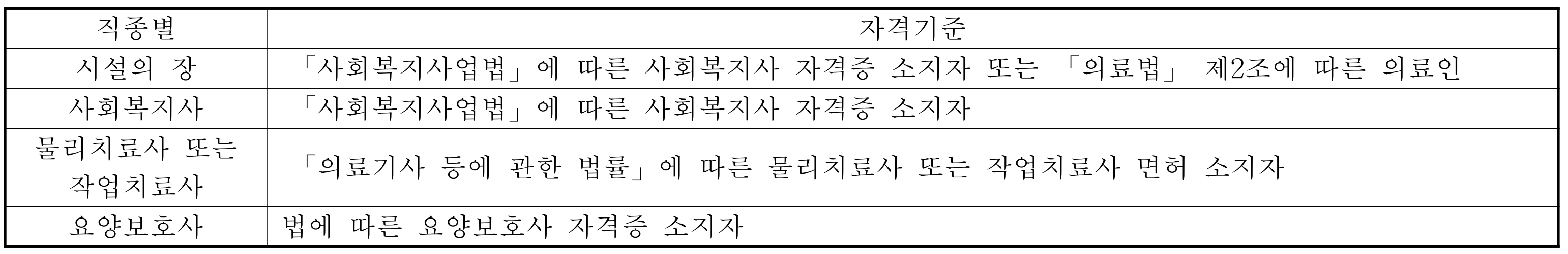 재가복지기관(방문요양센터, 주야간보호센터)의 시설장은 아래와 같은 자격을 필요로 한다.
