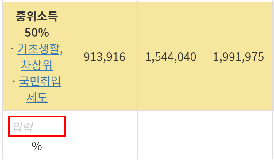 여기에 없는 기준 중위소득 값은 직접 아래와 같은 폼에 입력해서 값을 산출해 낼 수 있다.