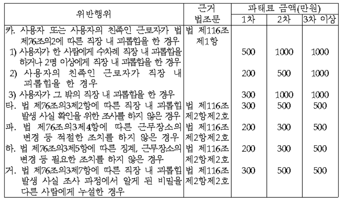 - 직장 내 괴롭힘 등 과태료 신설에 따른 세부 부과기준,