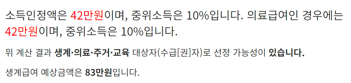 | 다만 이는 정확한 수치가 아니므로 자세한 것은 지자체에 문의해 보아야 한다. 수급자 여부는 꼭 주민센터에서 상담을 받도록 하자. |