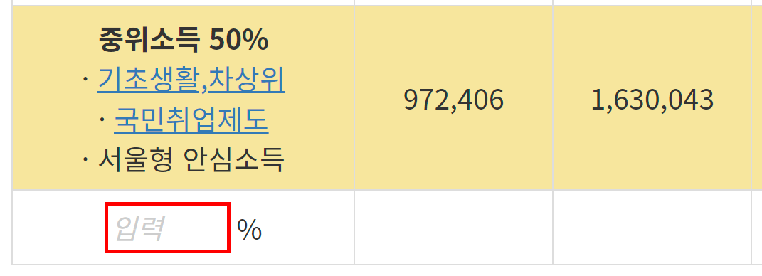 여기에 찾고자 하는 기준 중위소득이 없다면 엔젤시터의 기준중위소득 페이지에서 특정 %값만 입력하면 자동으로 알려준다.